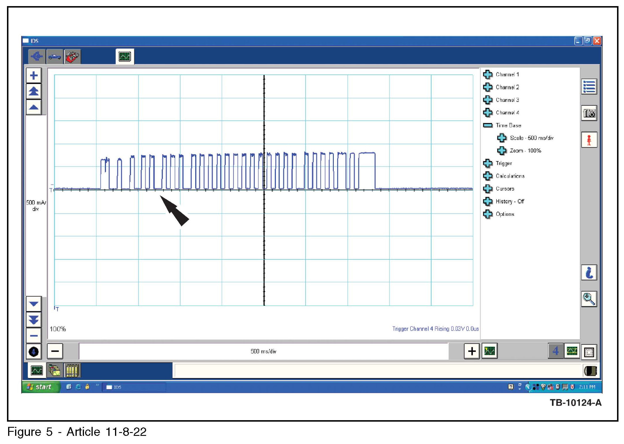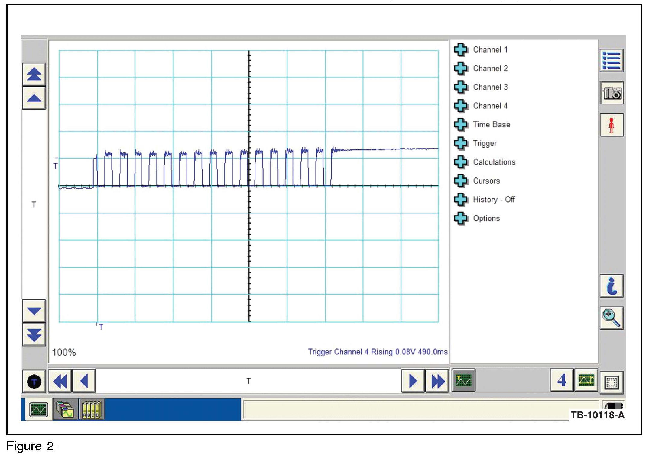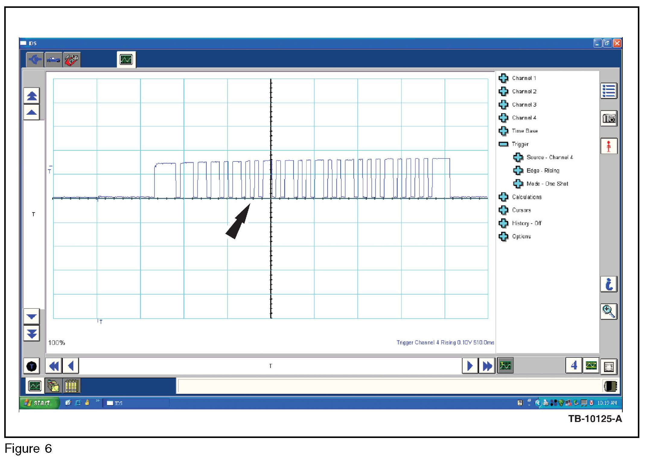10. Start the engine. A single waveform will be captured at startup and the scope will automatically stop. Compare the captured signal to the reference signal to determine if the stepper motor control signal is normal. Press the Run button before each engine start.