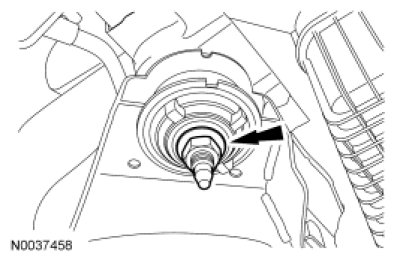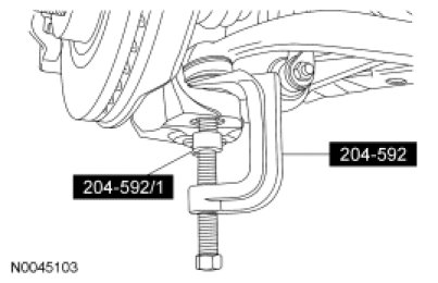 16. NOTICE: When the lower ball joint is separated from the wheel knuckle, the lower arm may strike the outer constant velocity (CV) joint boot with enough force to damage the boot clamp. This will result in a loss of grease from the outer CV joint. Place a block of wood, or similar item, between the lower arm and the outer CV joint to prevent the lower arm from striking the outer CV joint.