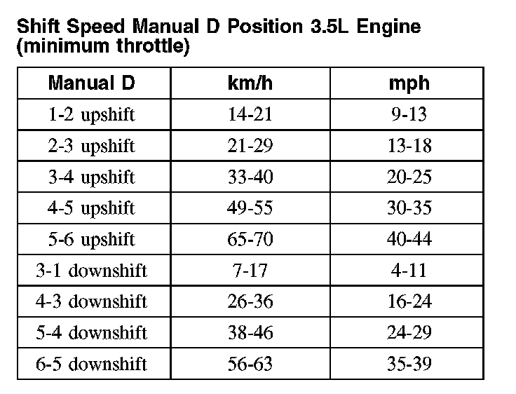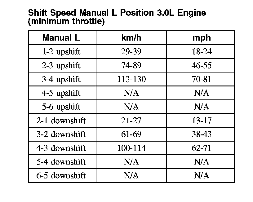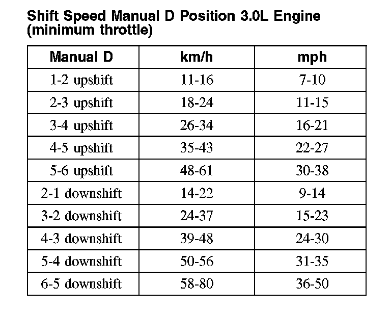 Shift Speed Manual D Position 3.0L Engine (minimum throttle)Shift Speed Manual D Position 3.0L Engine (minimum throttle):