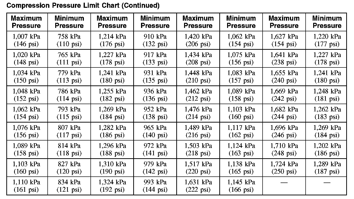 The indicated compression pressures are considered within specification if the lowest reading cylinder is at least 75% of the highest reading. Refer to the Compression Pressure Limit Chart.