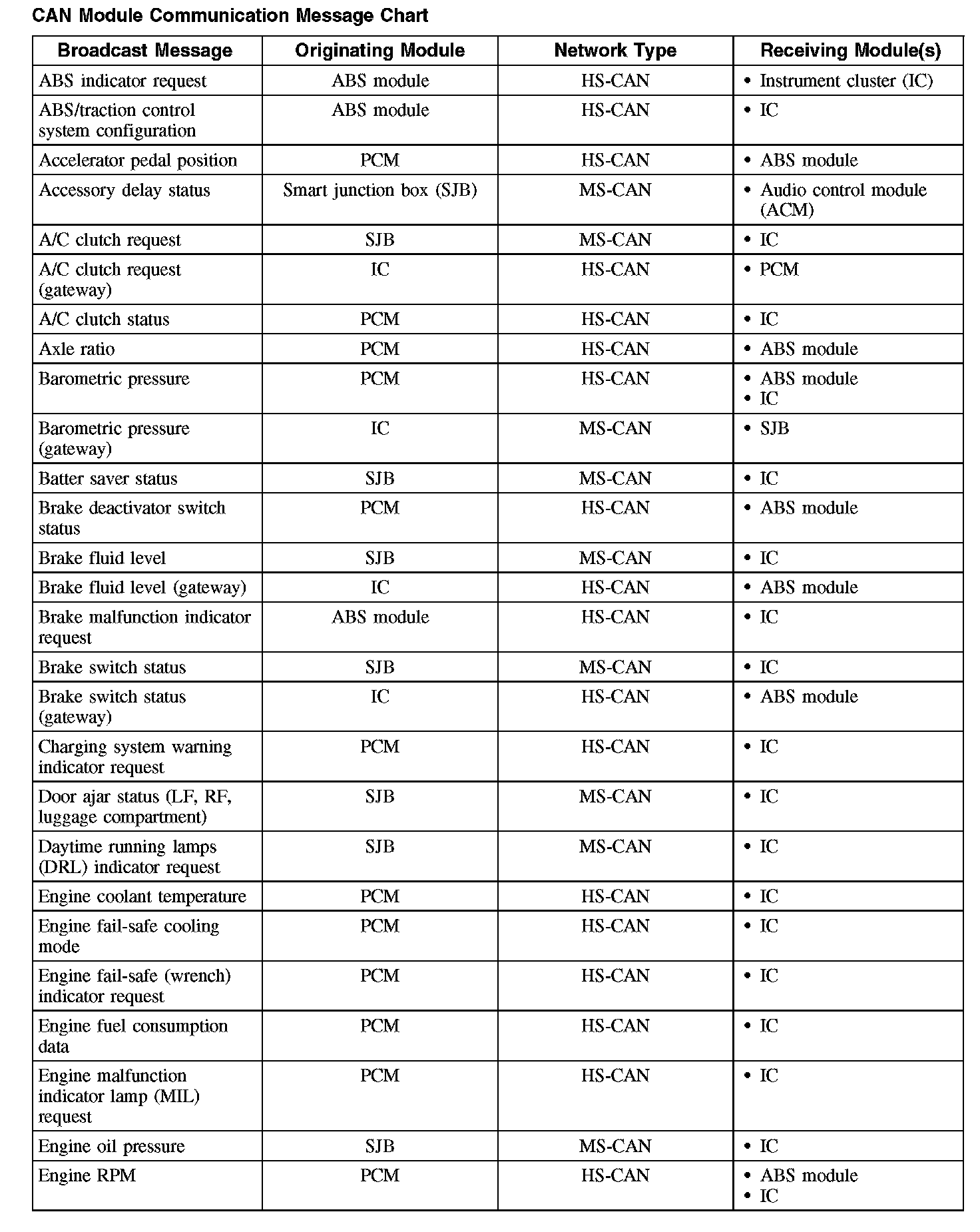 The following chart describes the specific CAN messages broadcast by each module, and the module(s) that receive the message: