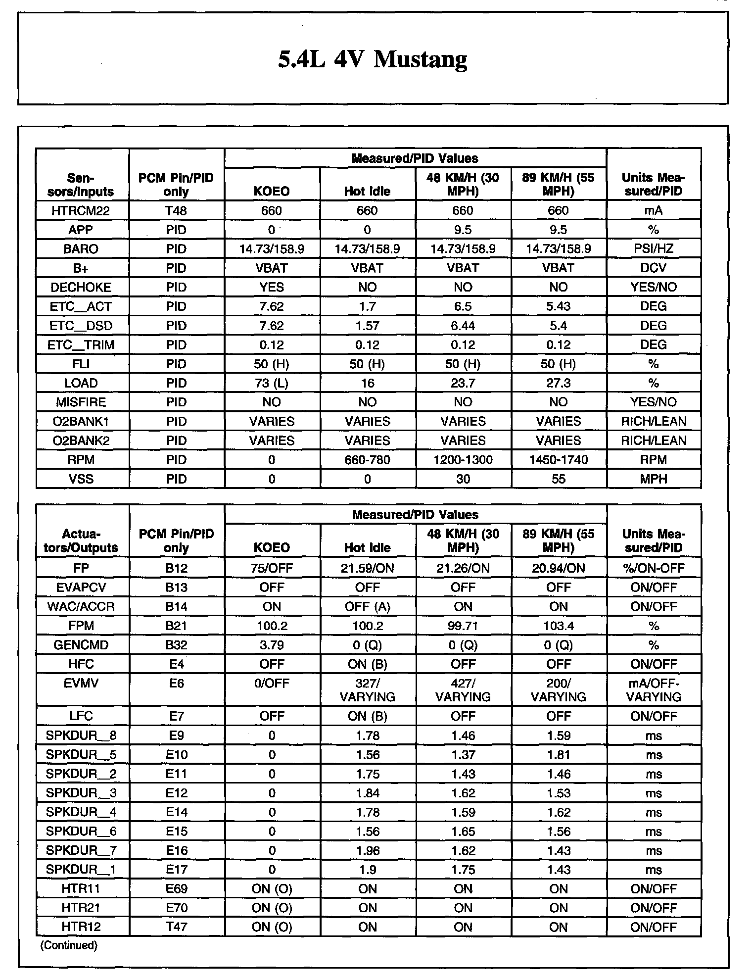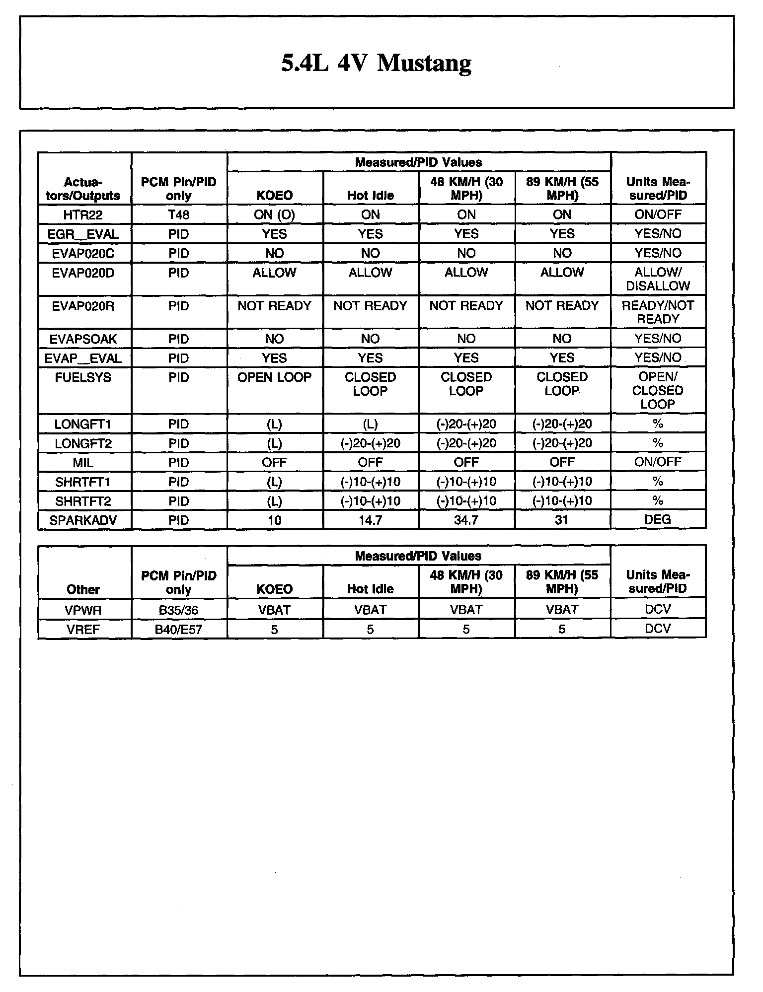 TYPICAL DIAGNOSTIC REFERENCE VALUES5.4L 4V Mustang (Part 1):