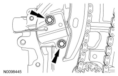 11. Position the timing chain tensioner and install the 2 bolts.