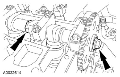 If the camshaft sprockets were not removed, use the flats on the camshafts to prevent camshaft rotation and loosen the 2 sprocket bolts.
