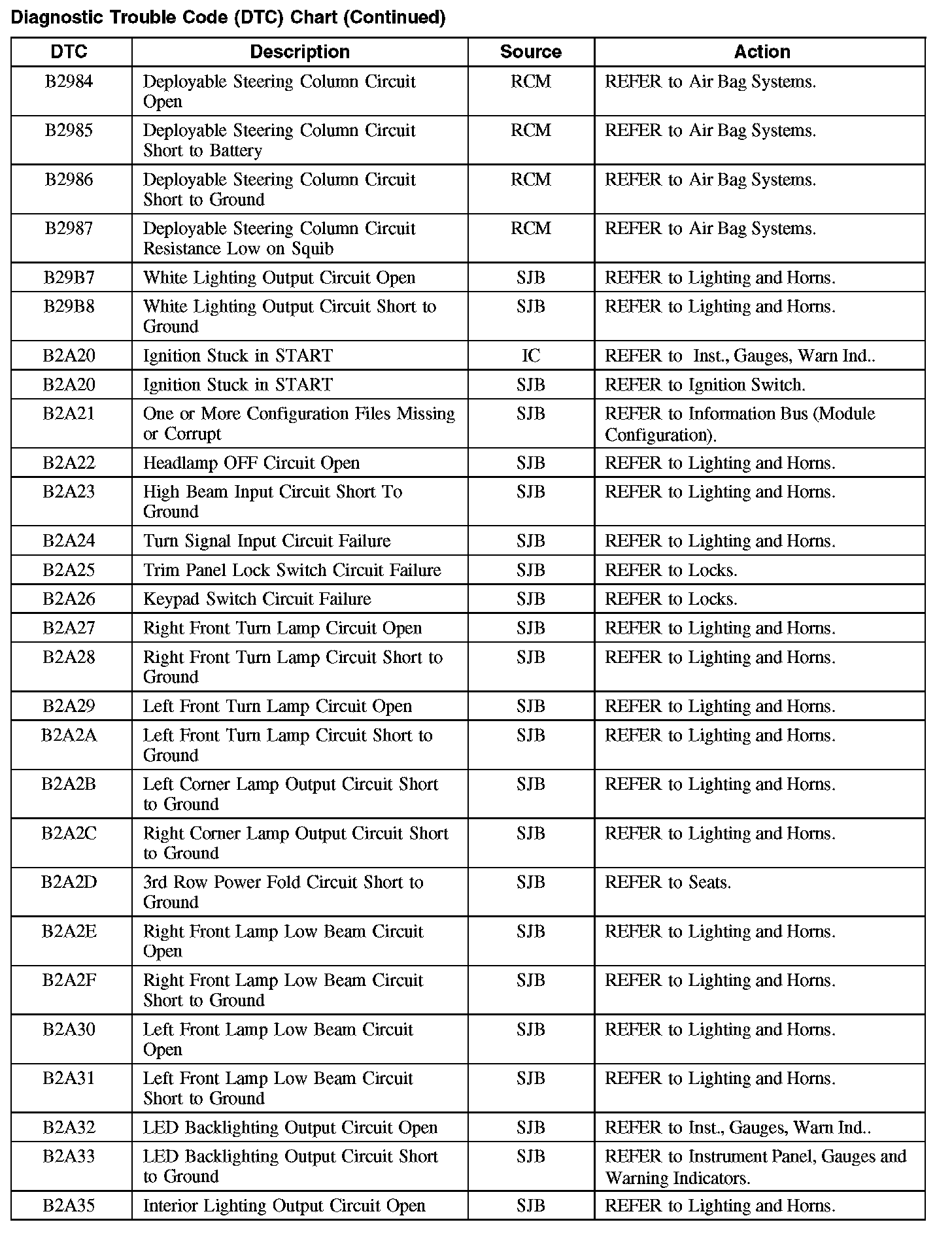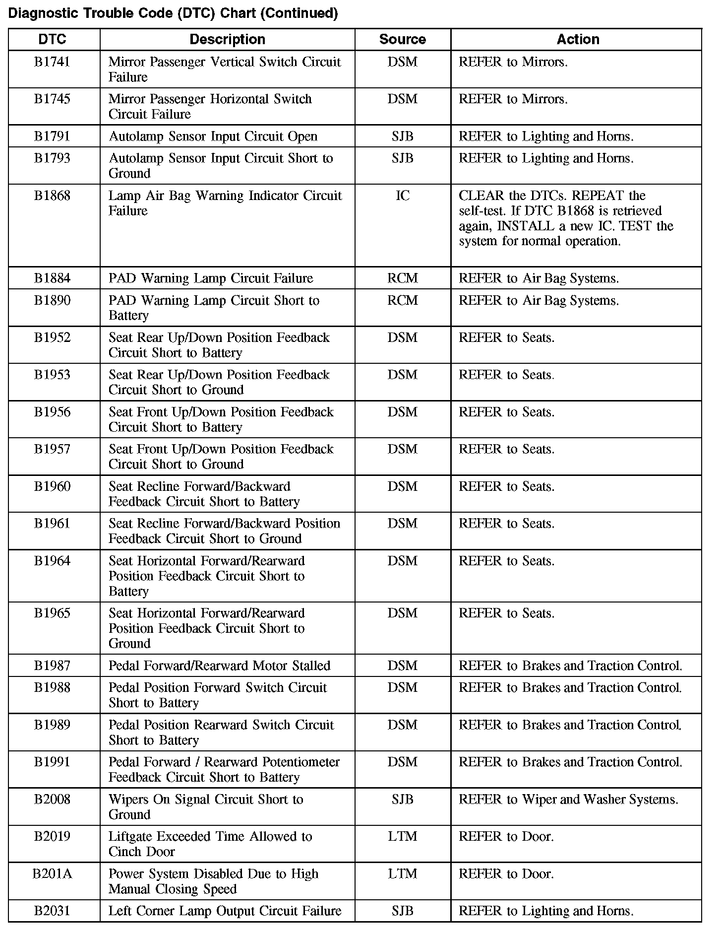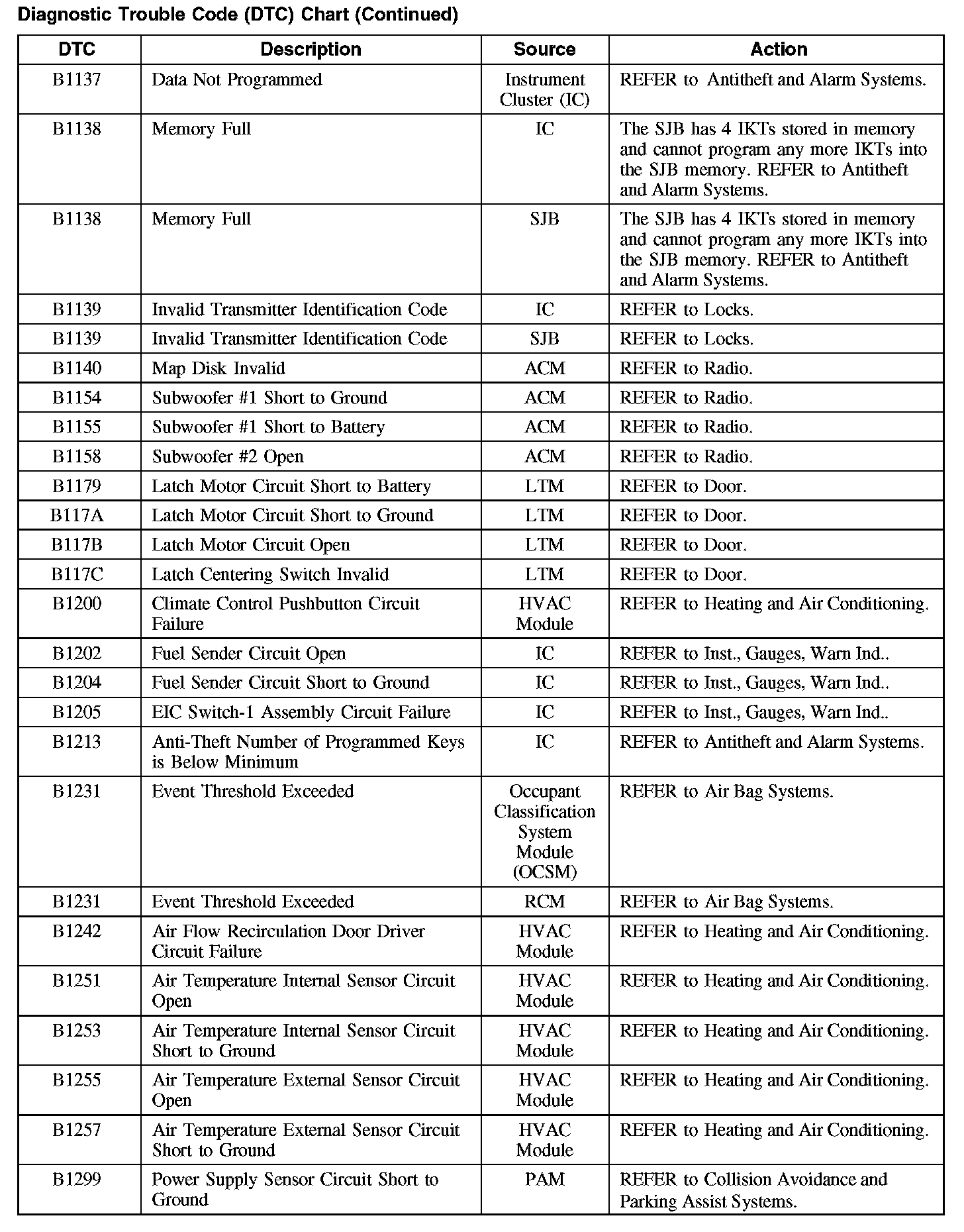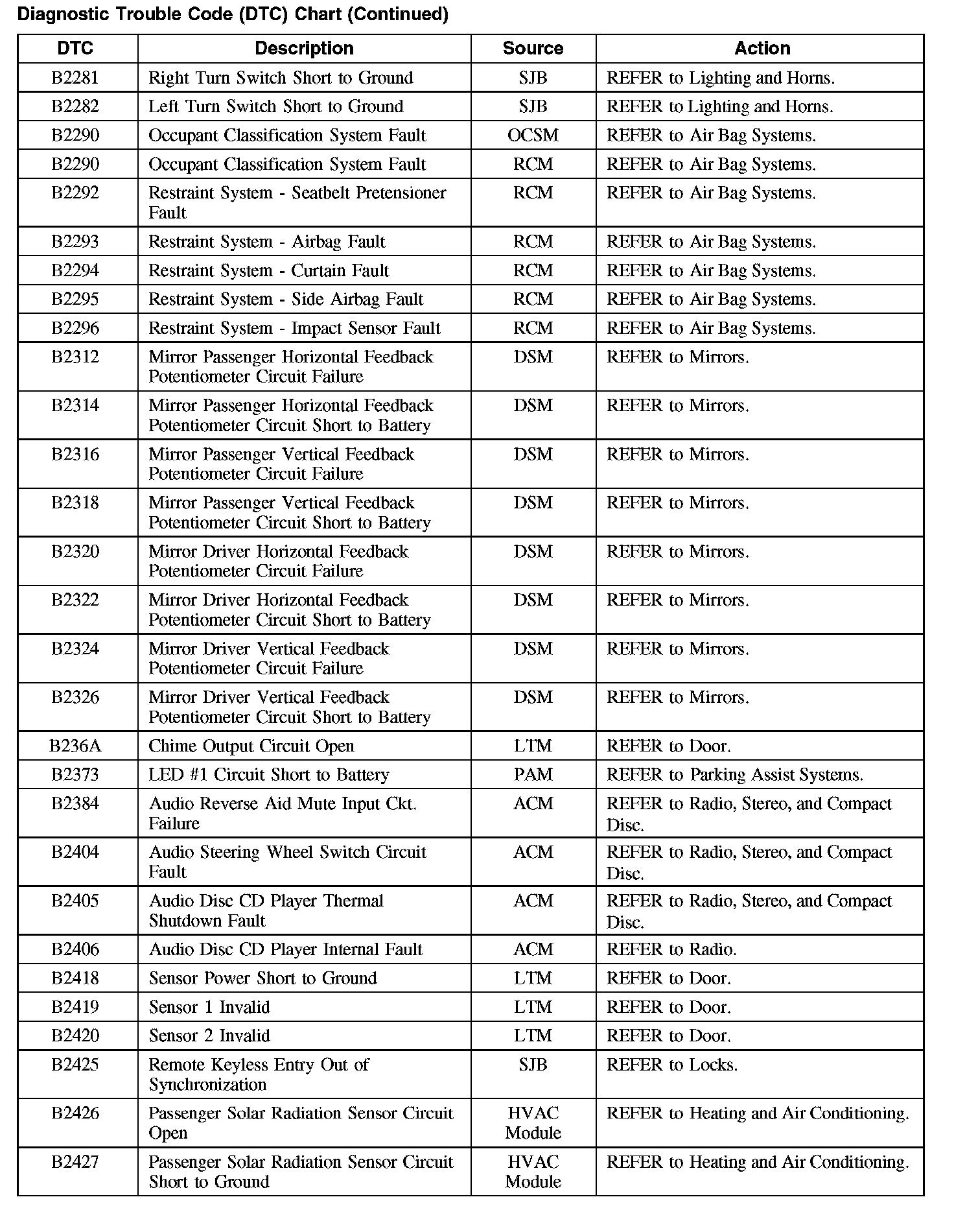 Home >> Ford >> 2008 >> Taurus AWD V6-3.5L >> Repair and Diagnosis >> Body and Frame >> Body Control Systems >> Testing and Inspection >> Diagnostic Trouble Code Descriptions >> Diagnostic Trouble Code (DTC) Chart