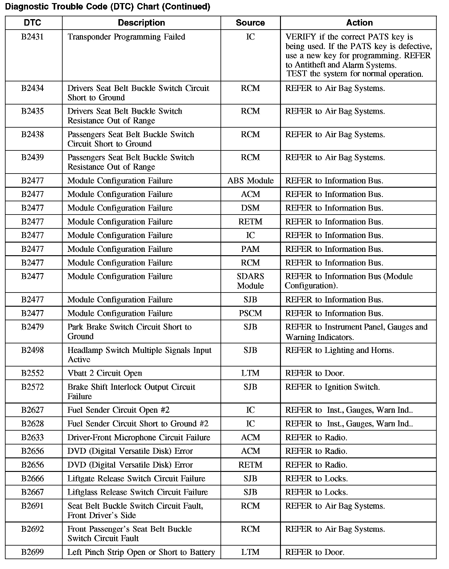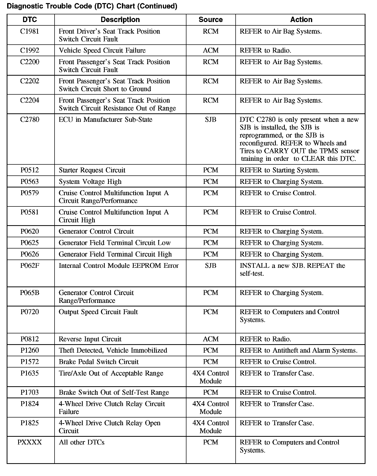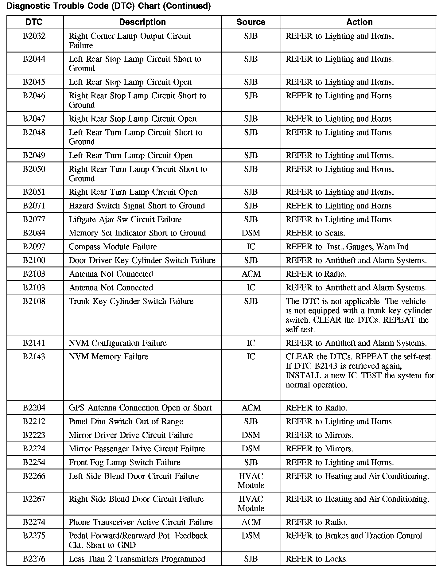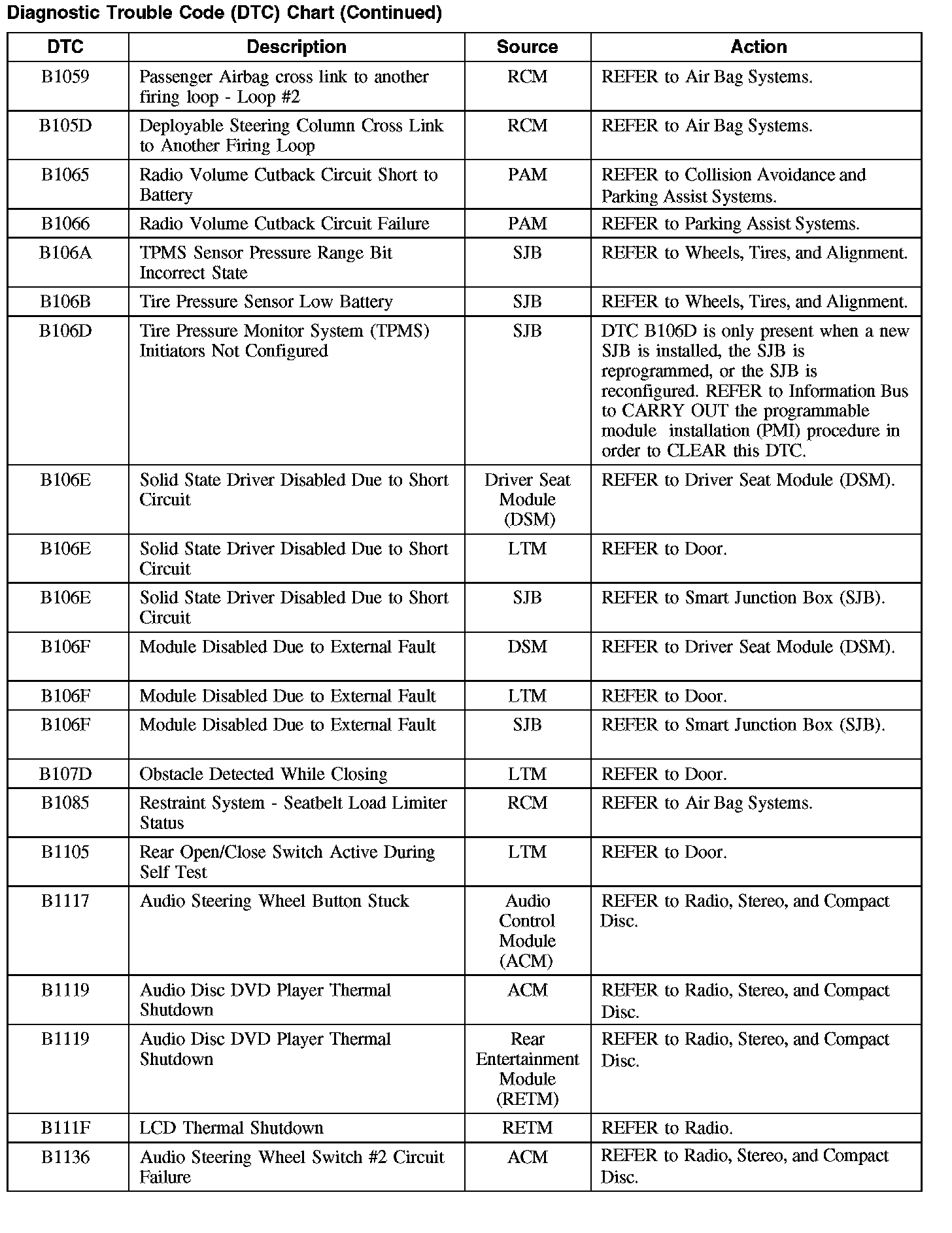 Home >> Ford >> 2008 >> Taurus AWD V6-3.5L >> Repair and Diagnosis >> Body and Frame >> Body Control Systems >> Testing and Inspection >> Diagnostic Trouble Code Descriptions >> Diagnostic Trouble Code (DTC) Chart