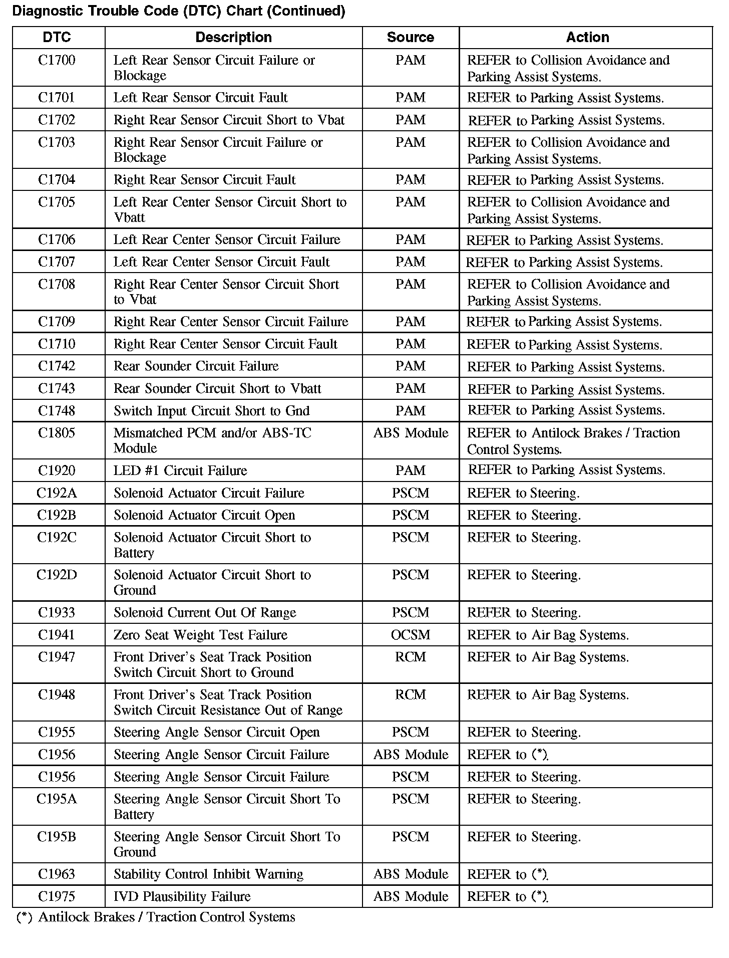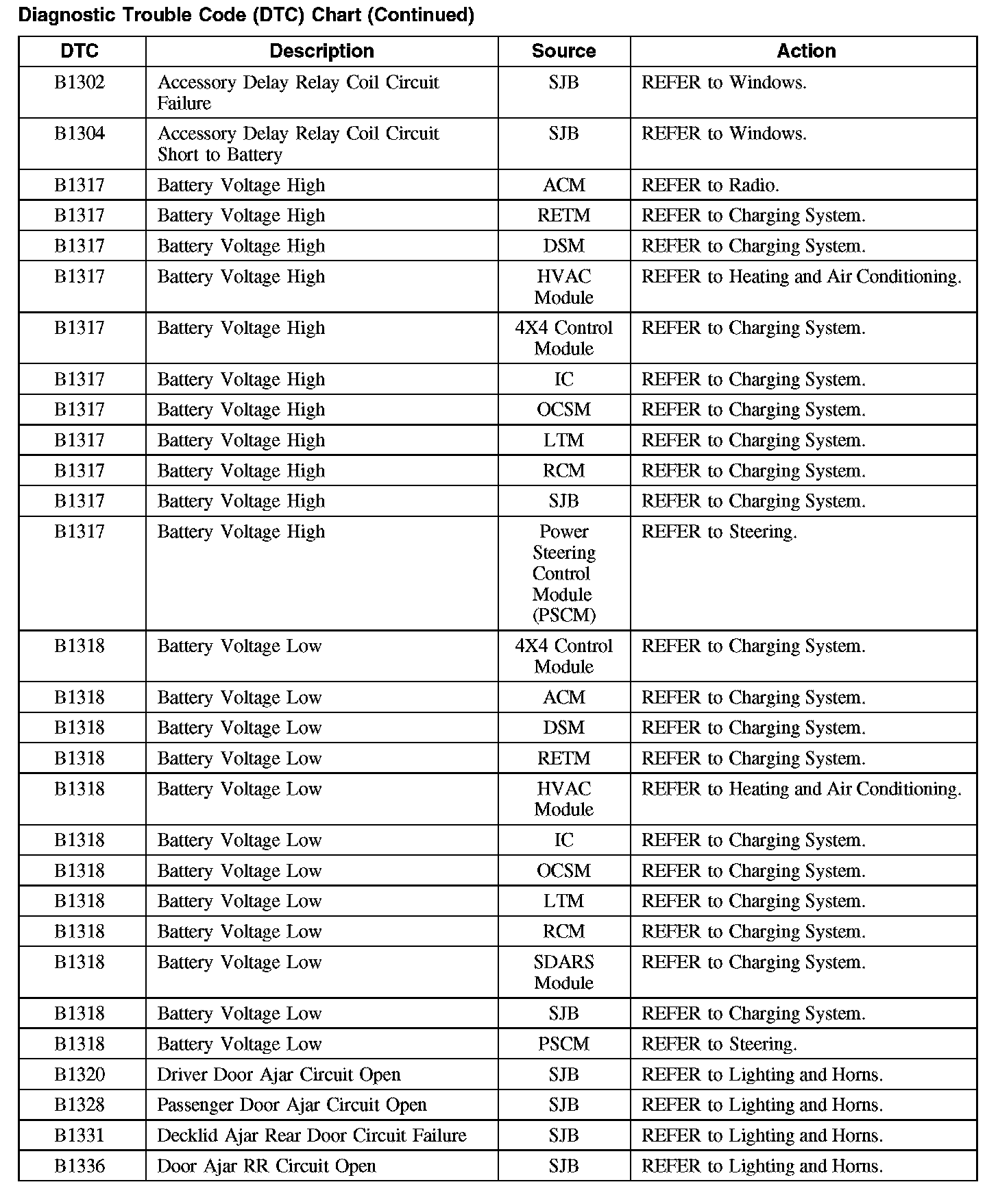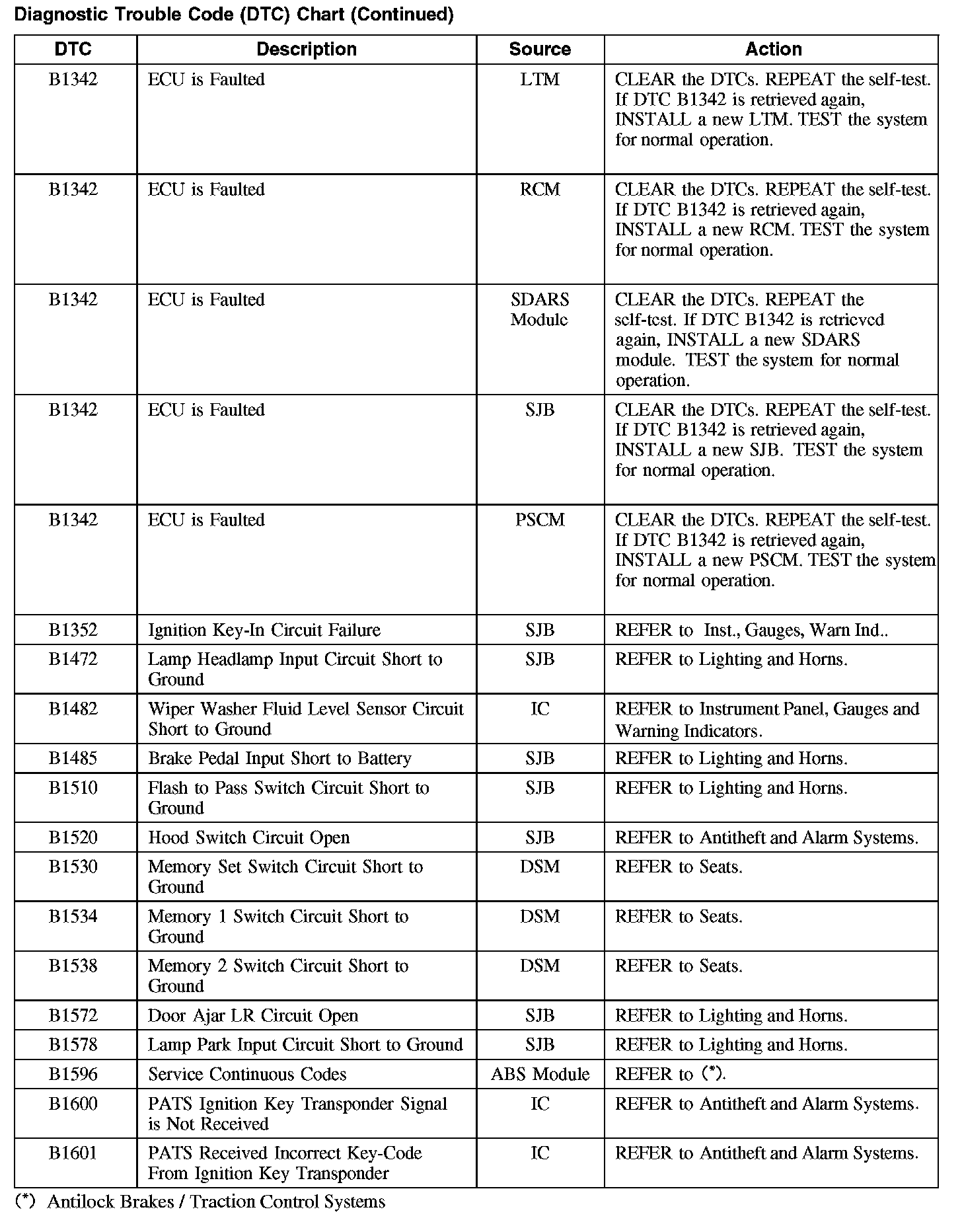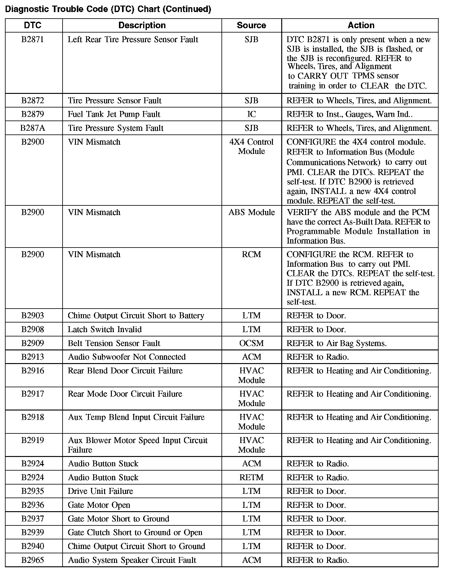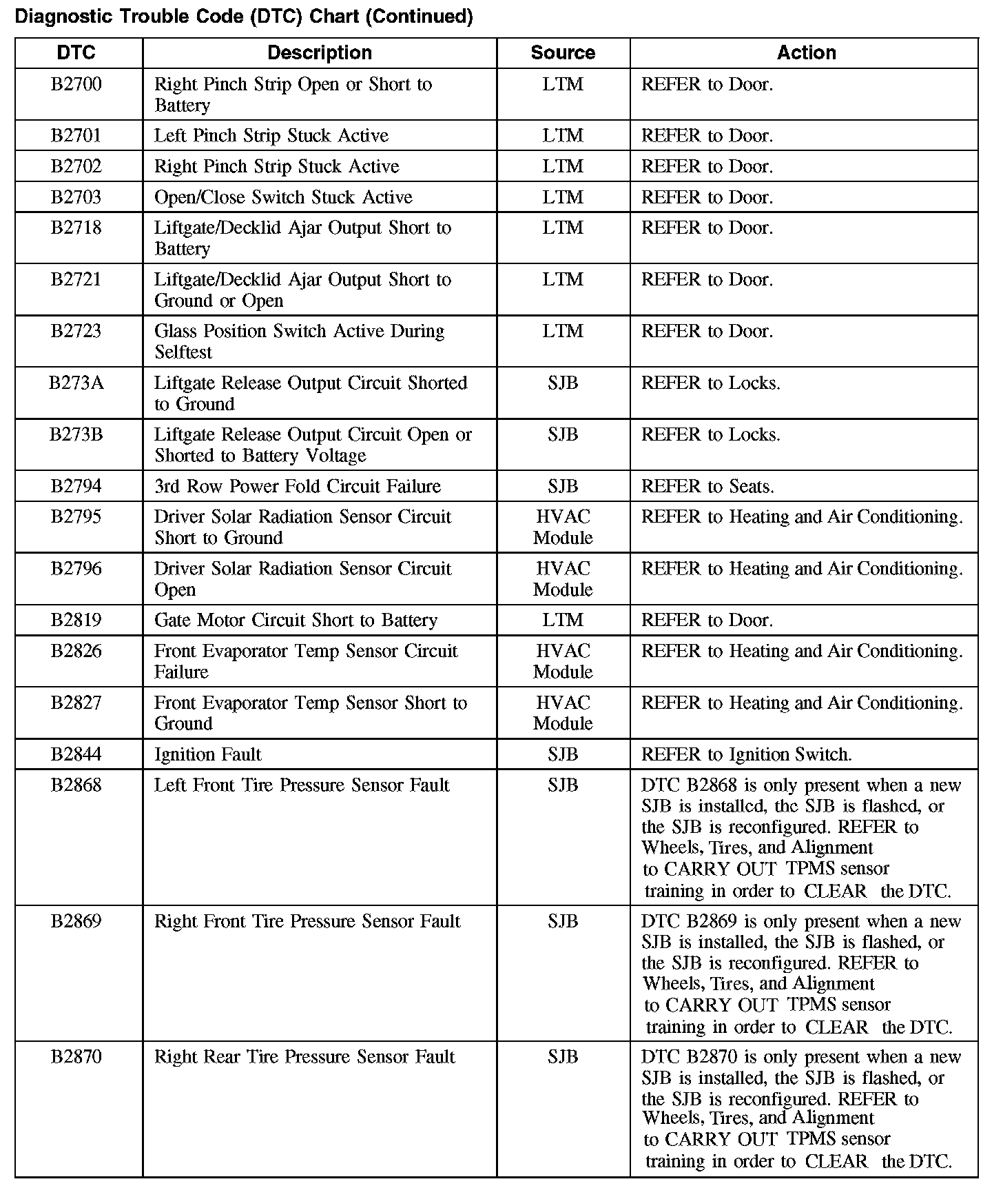 Home >> Ford >> 2008 >> Taurus AWD V6-3.5L >> Repair and Diagnosis >> Body and Frame >> Body Control Systems >> Testing and Inspection >> Diagnostic Trouble Code Descriptions >> Diagnostic Trouble Code (DTC) Chart
