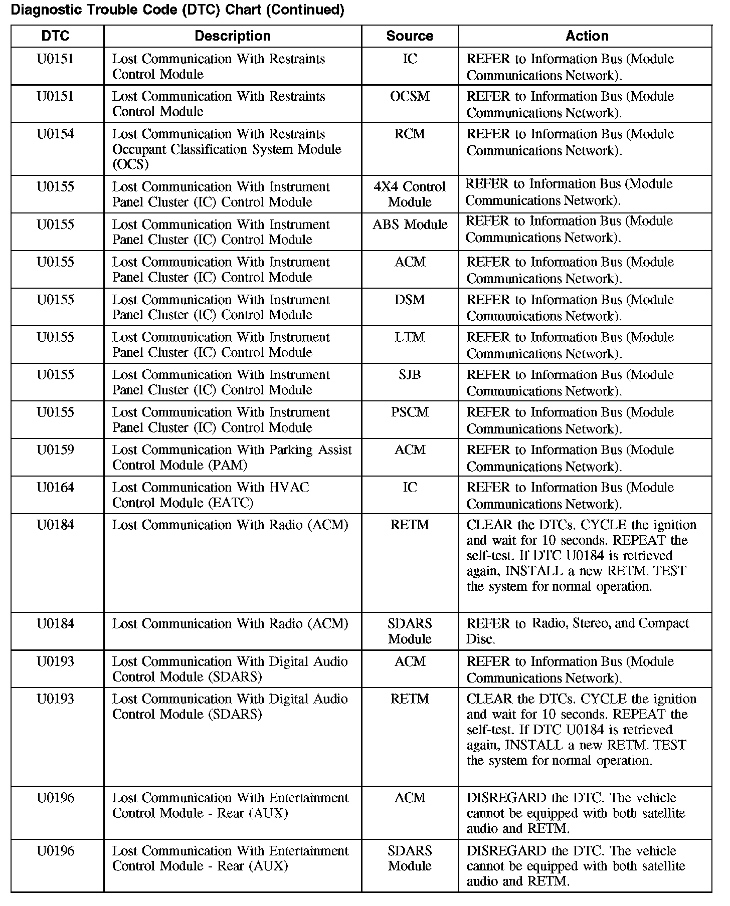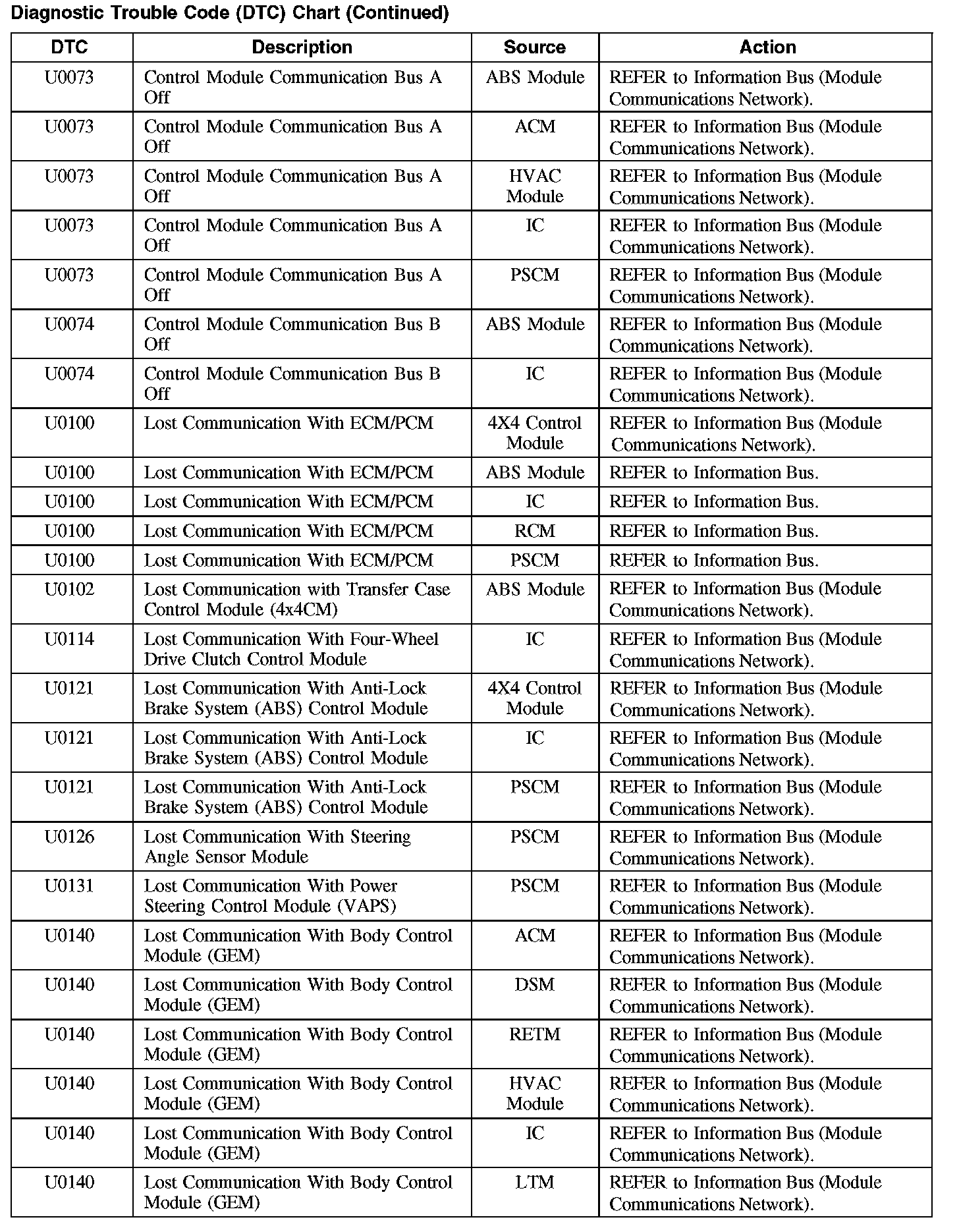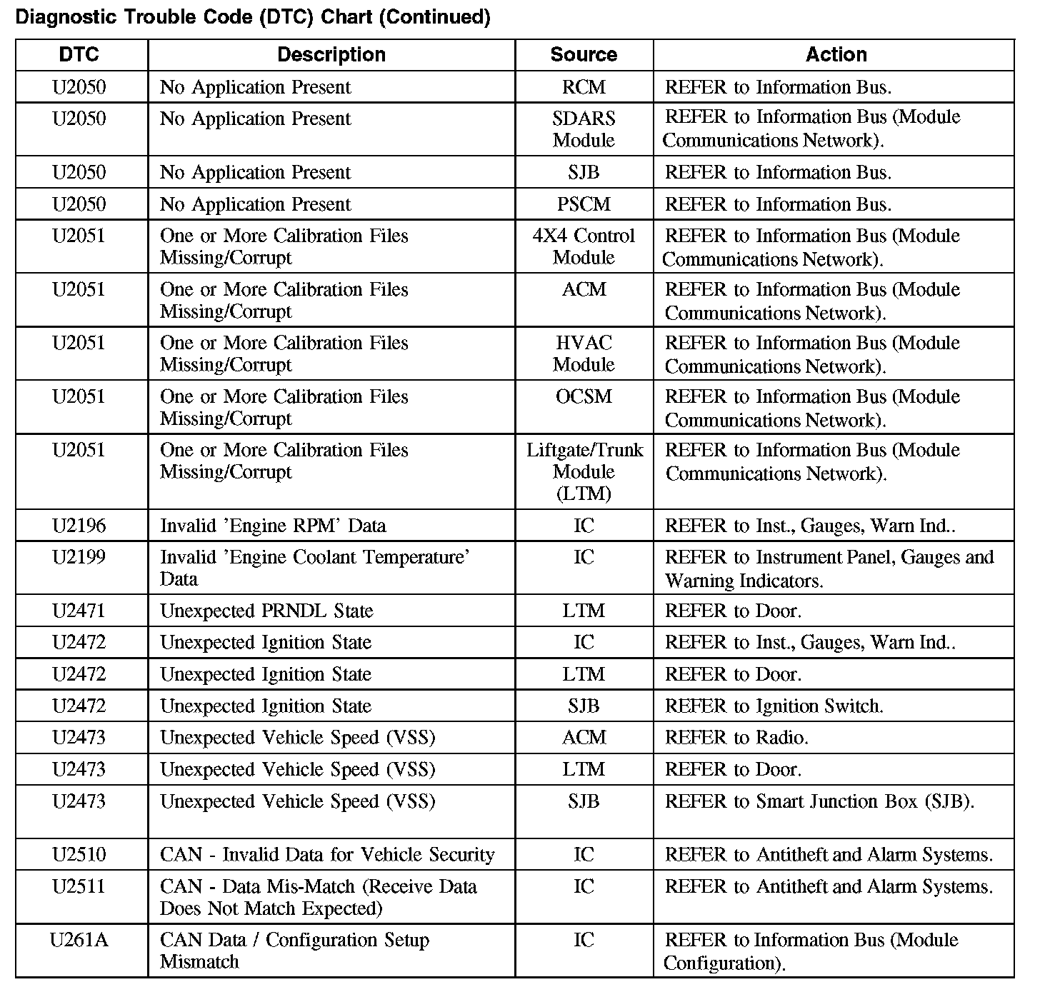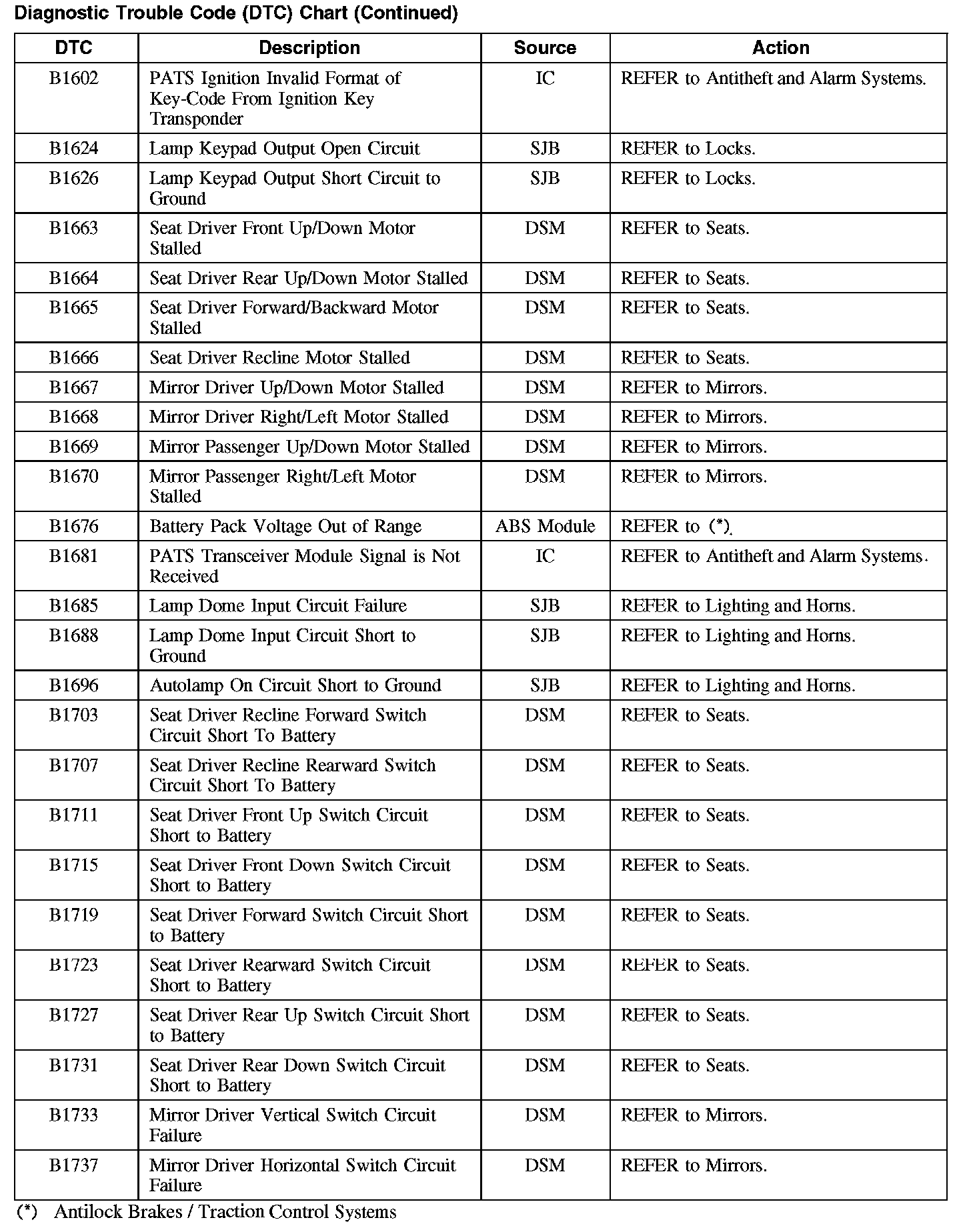 Home >> Ford >> 2008 >> Taurus AWD V6-3.5L >> Repair and Diagnosis >> Body and Frame >> Body Control Systems >> Testing and Inspection >> Diagnostic Trouble Code Descriptions >> Diagnostic Trouble Code (DTC) Chart