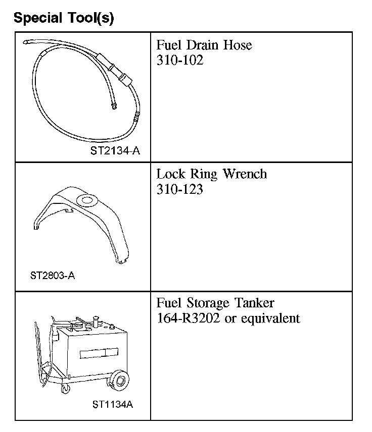 - The special tool must be inserted into the fuel tank filler pipe until the fitting on the end of the hose enters into the fuel tank spout, opening the check valve allowing fuel tank drainage. Carefully remove the hose using a gentle agitating motion to avoid detaching the hose from the fitting.