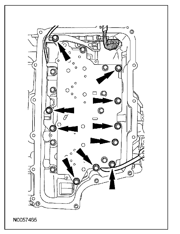 7. CAUTION: Make sure not to pinch the turbine shaft speed (TSS), output shaft speed (OSS) or transmission range (TR) sensor wiring harnesses when installing the solenoid body. Damage to the wiring harness will occur.
