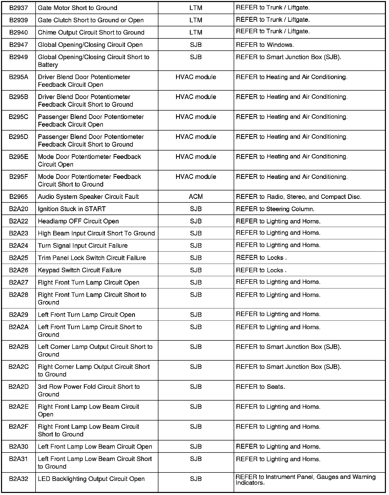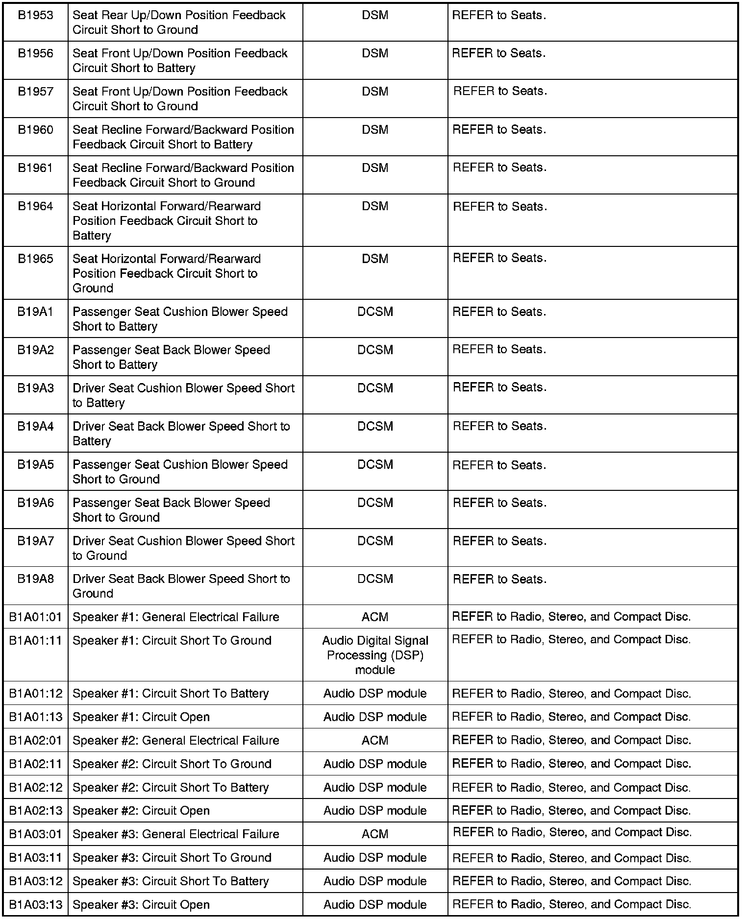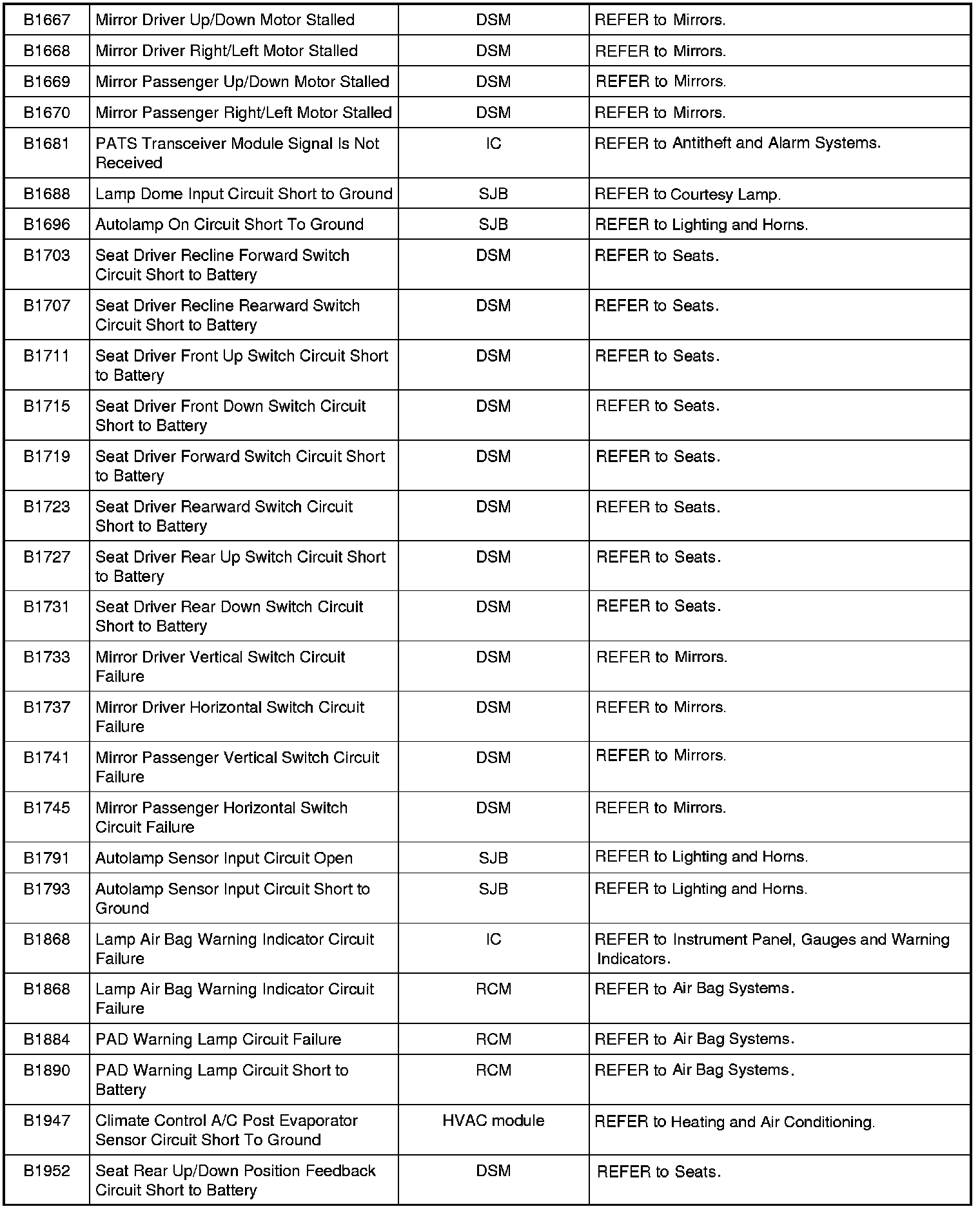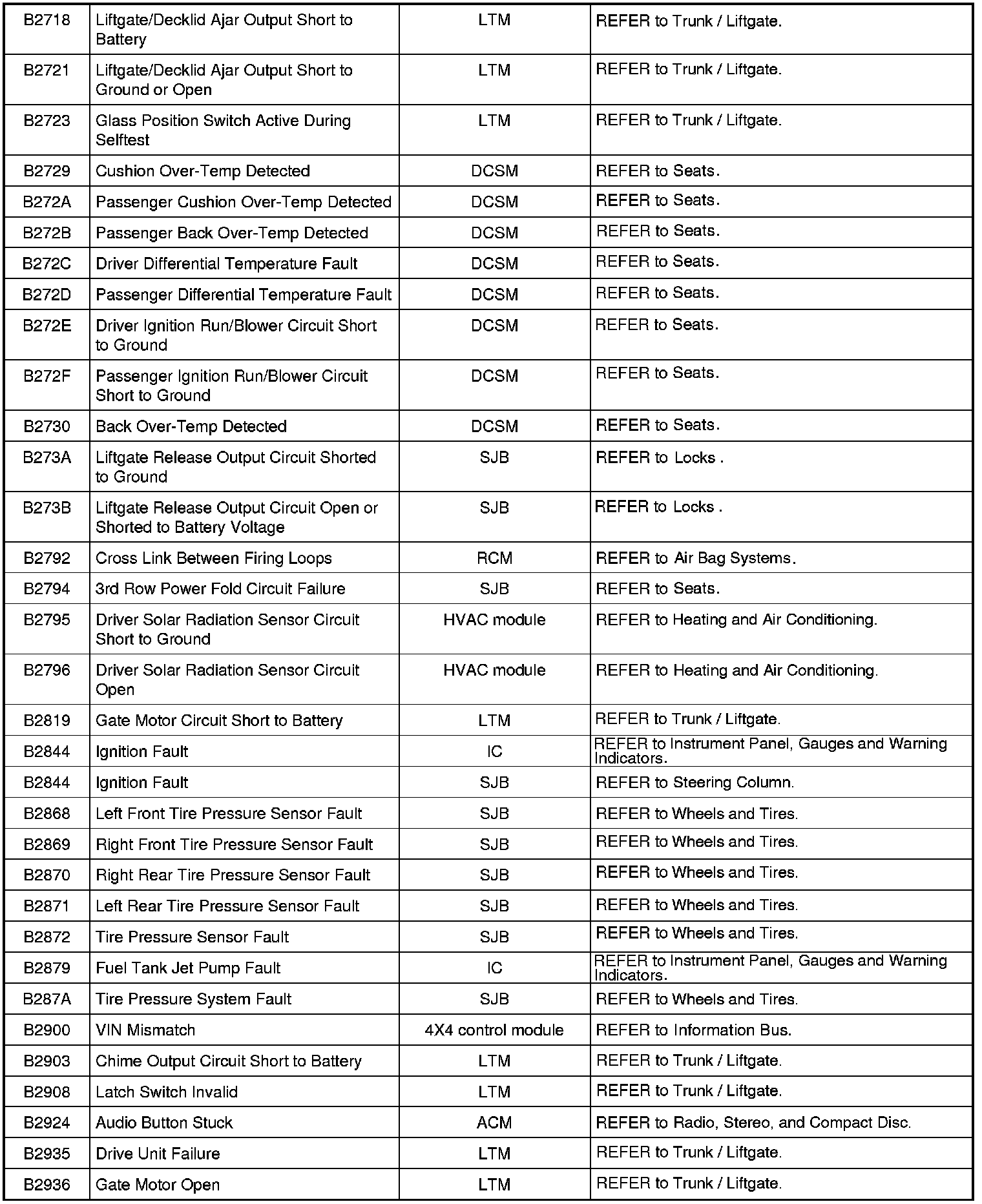 NOTE: Some of these modules utilize a 5-character DTC followed by a 2-character failure-type code. The failure-type code provides information about specific fault conditions such as opens, or shorts to ground. Continuous memory DTCs have an additional 2-character DTC status code suffix to assist in determining DTC history.