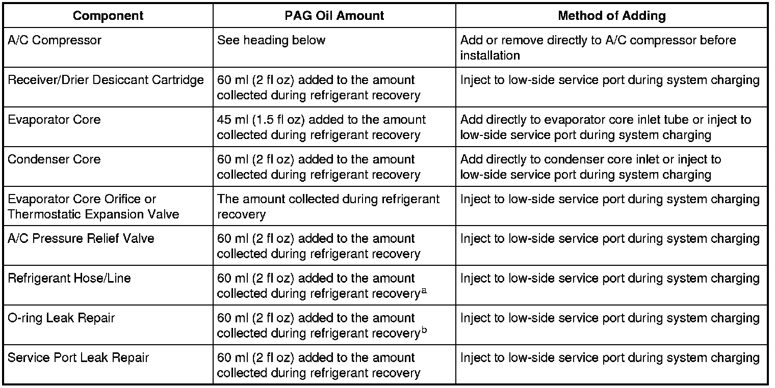 b The amount specified may be used for one or multiple O-ring leak repairs. Do not multiply the refrigerant oil amount by the number of O-ring leaks being repaired.