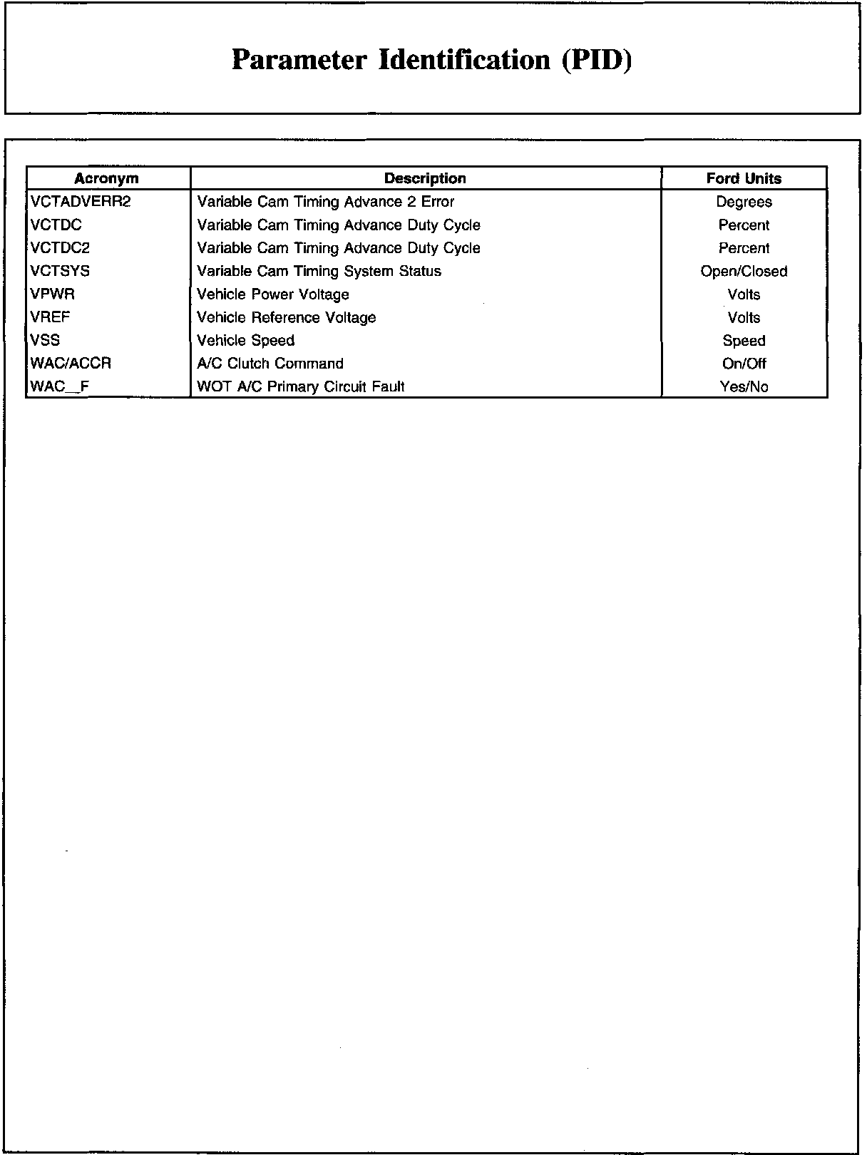 Home >> Ford >> 2009 >> Edge AWD V6-3.5L >> Repair and Diagnosis >> Powertrain Management >> Computers and Control Systems >> Testing and Inspection >> Scan Tool Testing and Procedures >> Parameter Identification (PID)