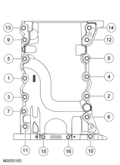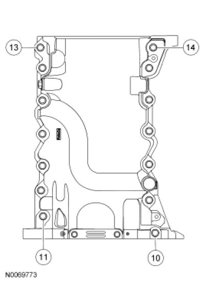 Install the remaining oil pan bolts. Tighten all the oil pan bolts in the sequence shown.