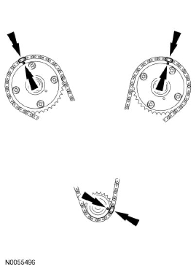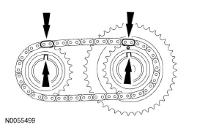 Install the primary timing chain with the colored links aligned with the timing marks on the VCT assemblies and the crankshaft sprocket.