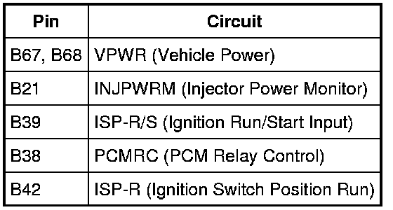 - harness circuits: B+, IGN START/RUN, INJPWRM, ISP-R, ISP-R/S, PCMRC and VPWR