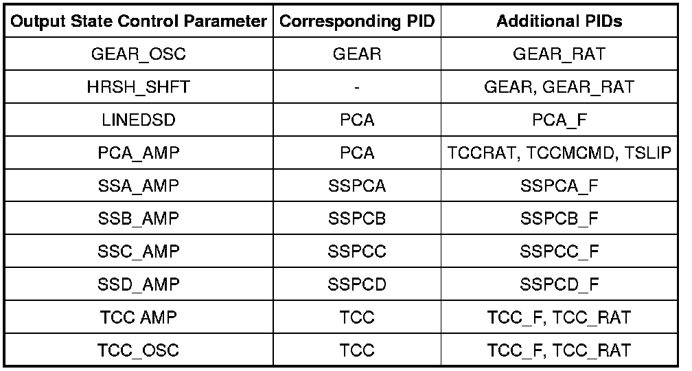 To confirm that the output state control value was sent by the scan tool and the PCM has accepted the output state control command, a corresponding PID for each output state control parameter must be monitored. After SENDING the output state control value, the corresponding PID value should be the same as the output state control value that was sent. Additional PIDs are listed that may be monitored to help the technician accurately diagnose the transaxle.