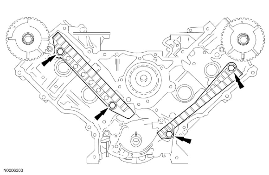 Position the LH and RH timing chain guides and install the 4 bolts.Tighten to 10 Nm (89 lb-in).