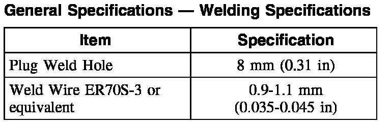 - Factory spot welds may be substituted with either STRW or MIG plug welds. Spot/plug welds should equal factory welds in both location and quantity. Do not place a new spot weld directly over an original weld location. Plug weld hole should equal 8 mm (0.31 in) diameter.