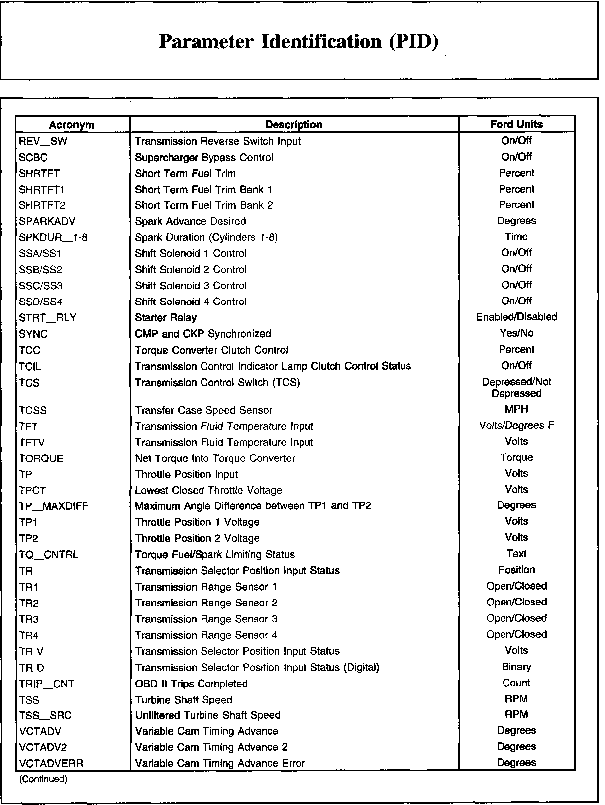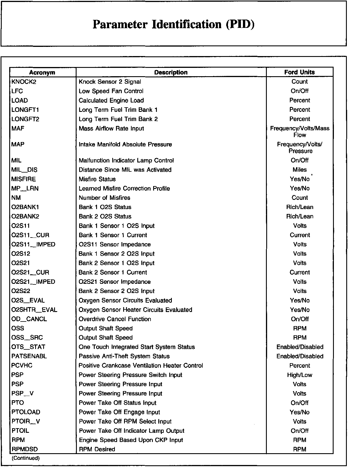 Home >> Ford >> 2009 >> Explorer 2WD V8-4.6L >> Repair and Diagnosis >> Powertrain Management >> Computers and Control Systems >> Testing and Inspection >> Scan Tool Testing and Procedures >> Parameter Identification (PID)