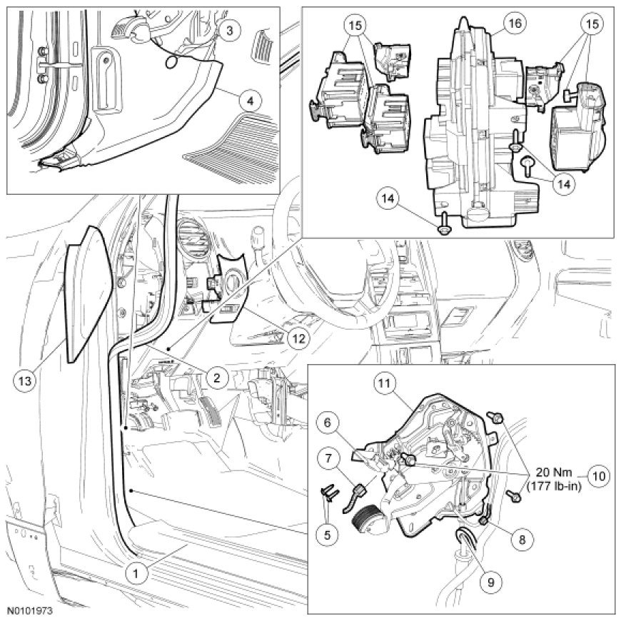 13. From under the instrument panel, remove the third (lower right) SJB bolt.