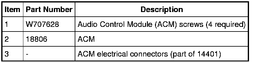 NOTE: It is not necessary to remove the Audio Control Module (ACM) to retrieve the part number. For additional information, refer to Audio Control Module (ACM) Self-Diagnostic Mode Audio Control Module (ACM) Self-Diagnostic Mode.