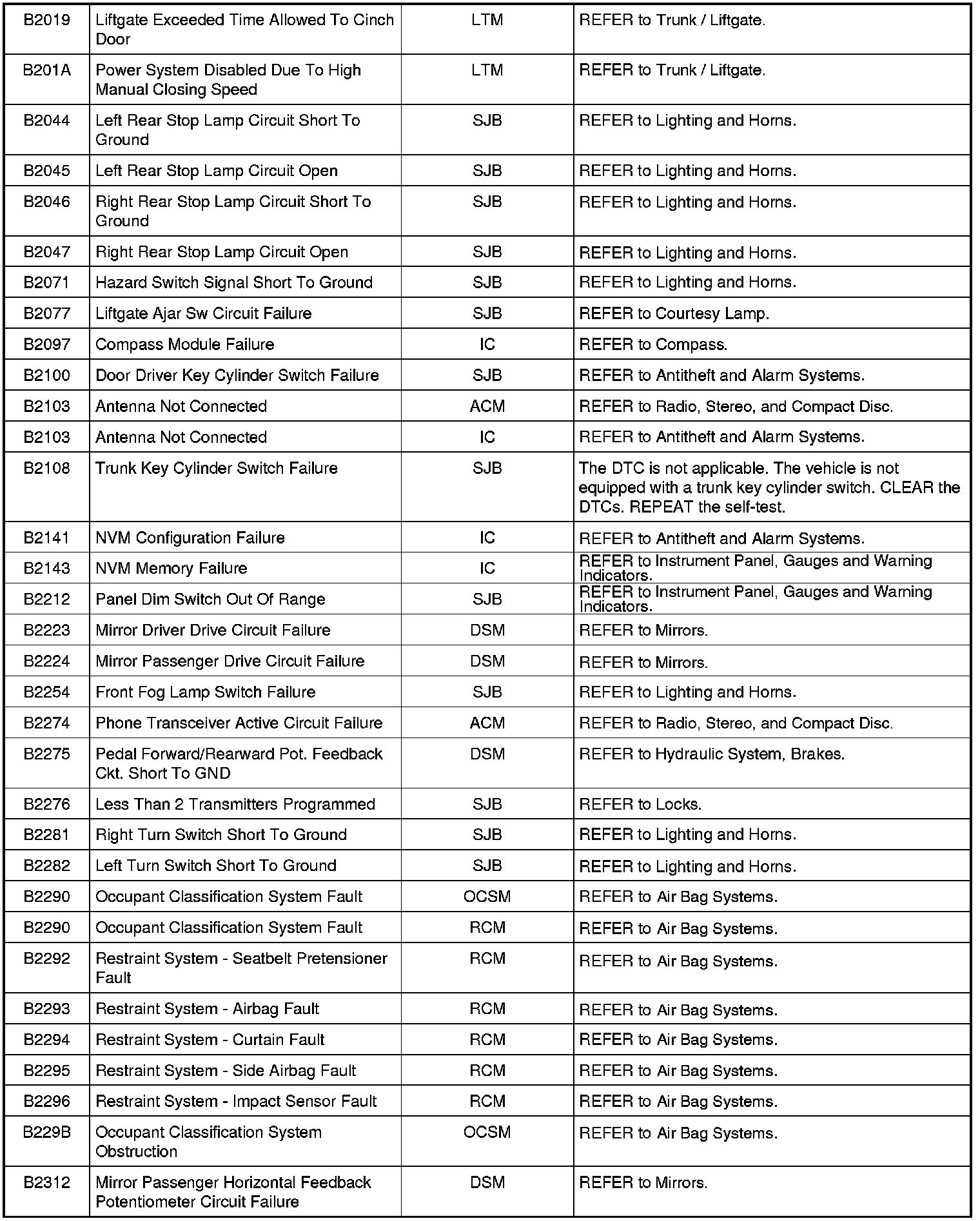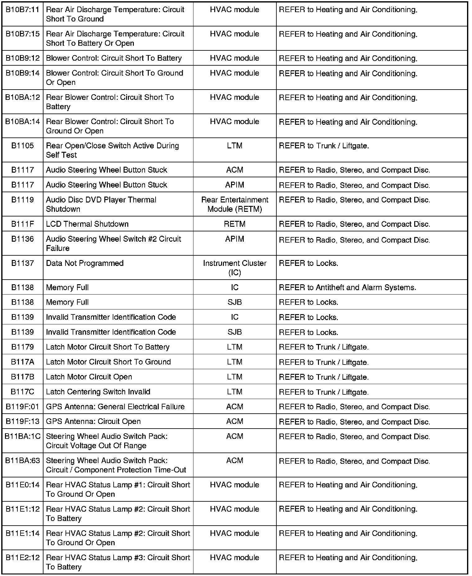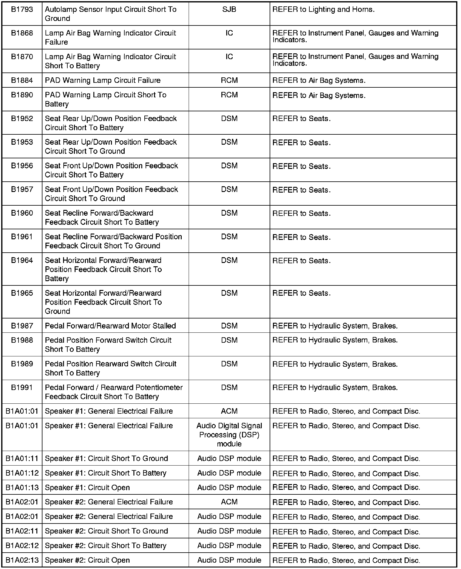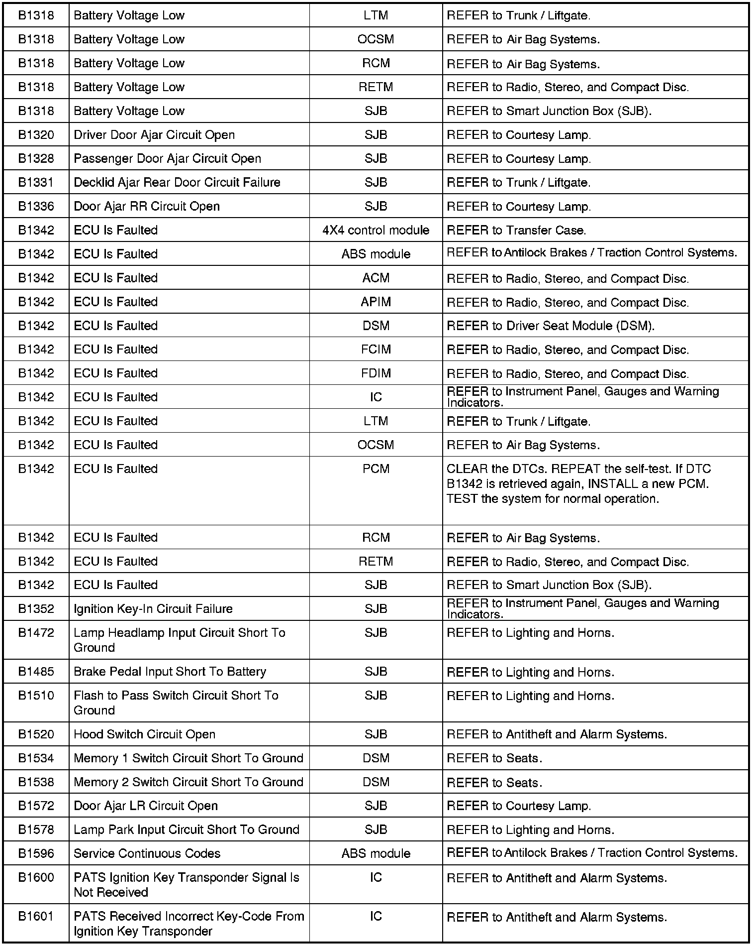 NOTE: Some of these modules utilize a 5-character DTC followed by a 2-character failure-type code. The failure-type code provides information about specific fault conditions such as opens, or shorts to ground. Continuous memory DTCs have an additional 2-character DTC status code suffix to assist in determining DTC history.