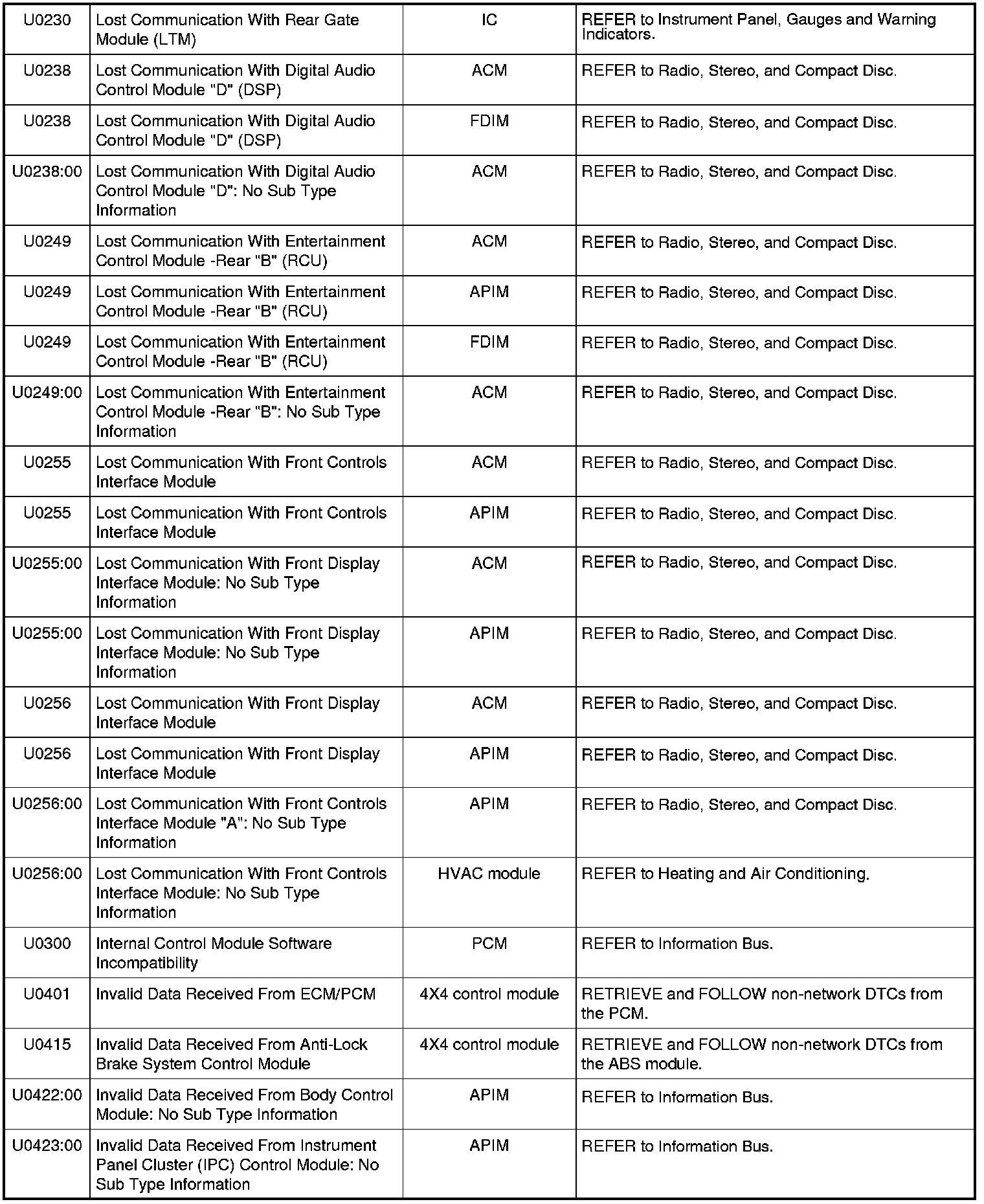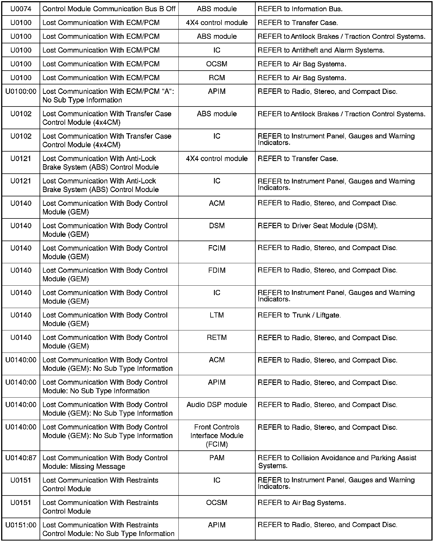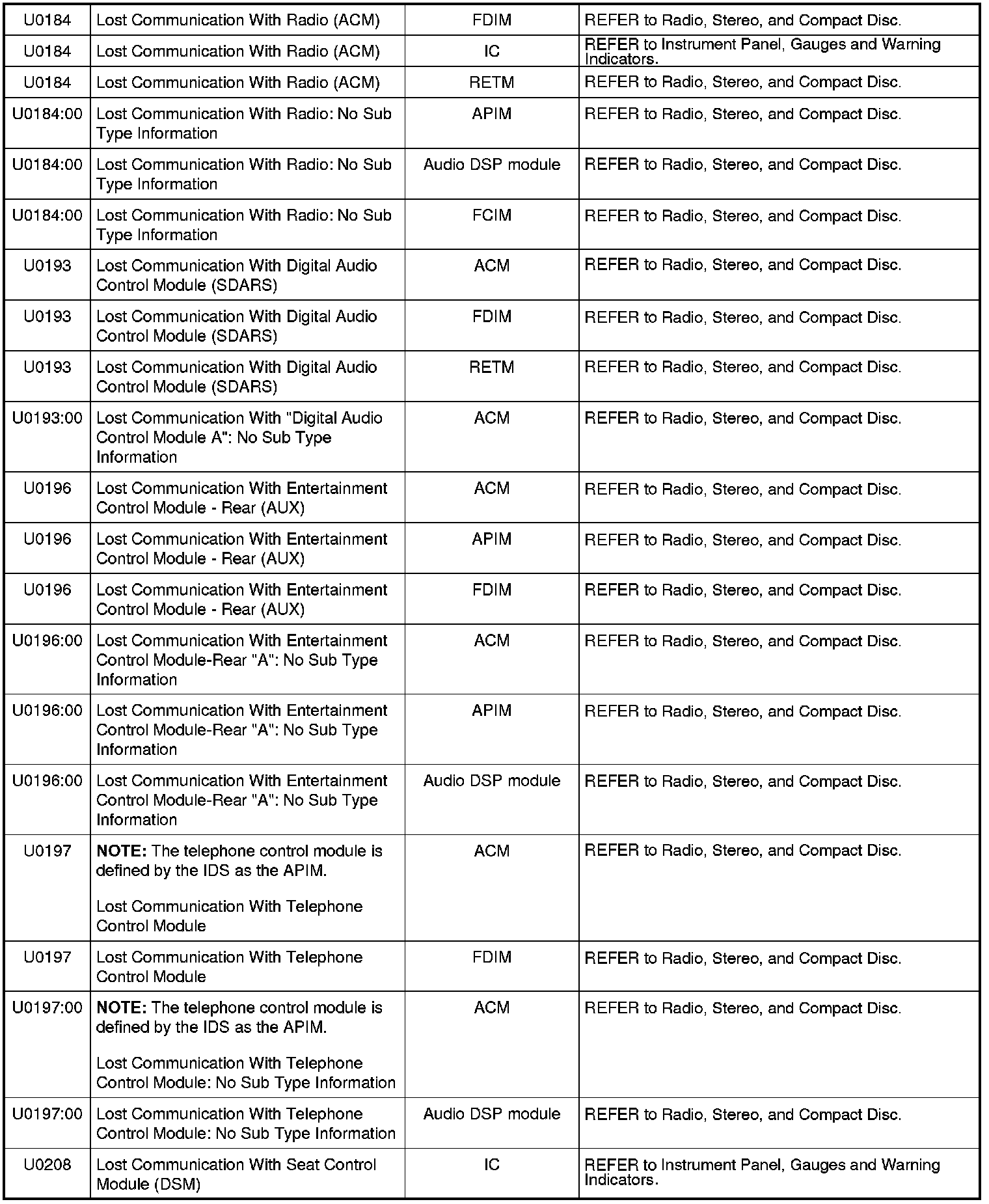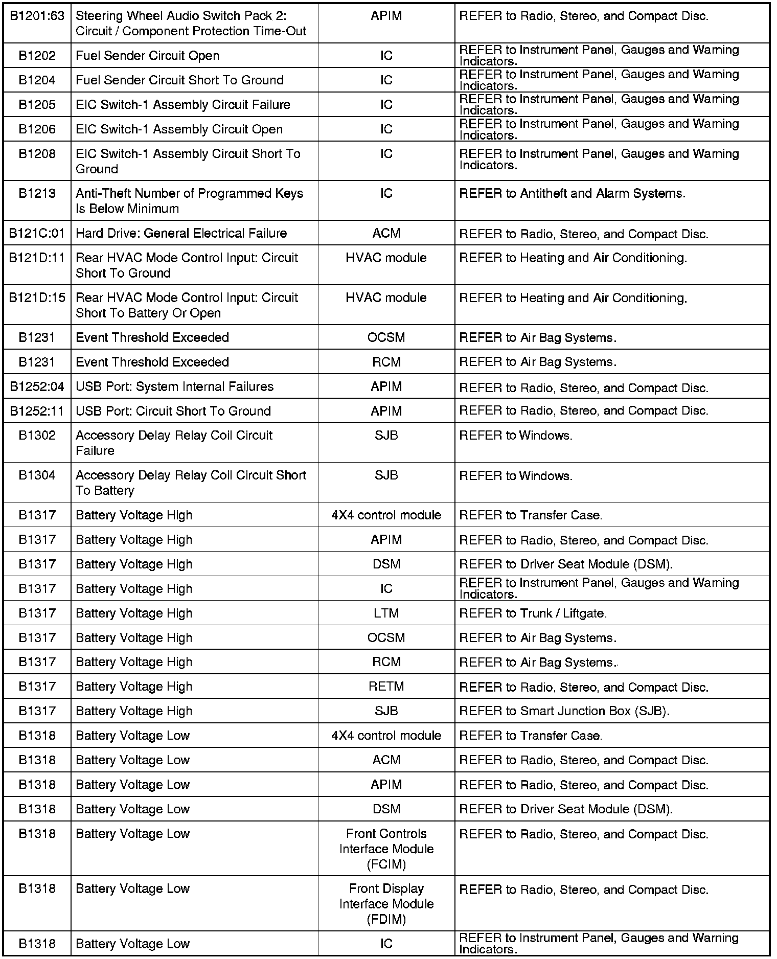 NOTE: Some of these modules utilize a 5-character DTC followed by a 2-character failure-type code. The failure-type code provides information about specific fault conditions such as opens, or shorts to ground. Continuous memory DTCs have an additional 2-character DTC status code suffix to assist in determining DTC history.