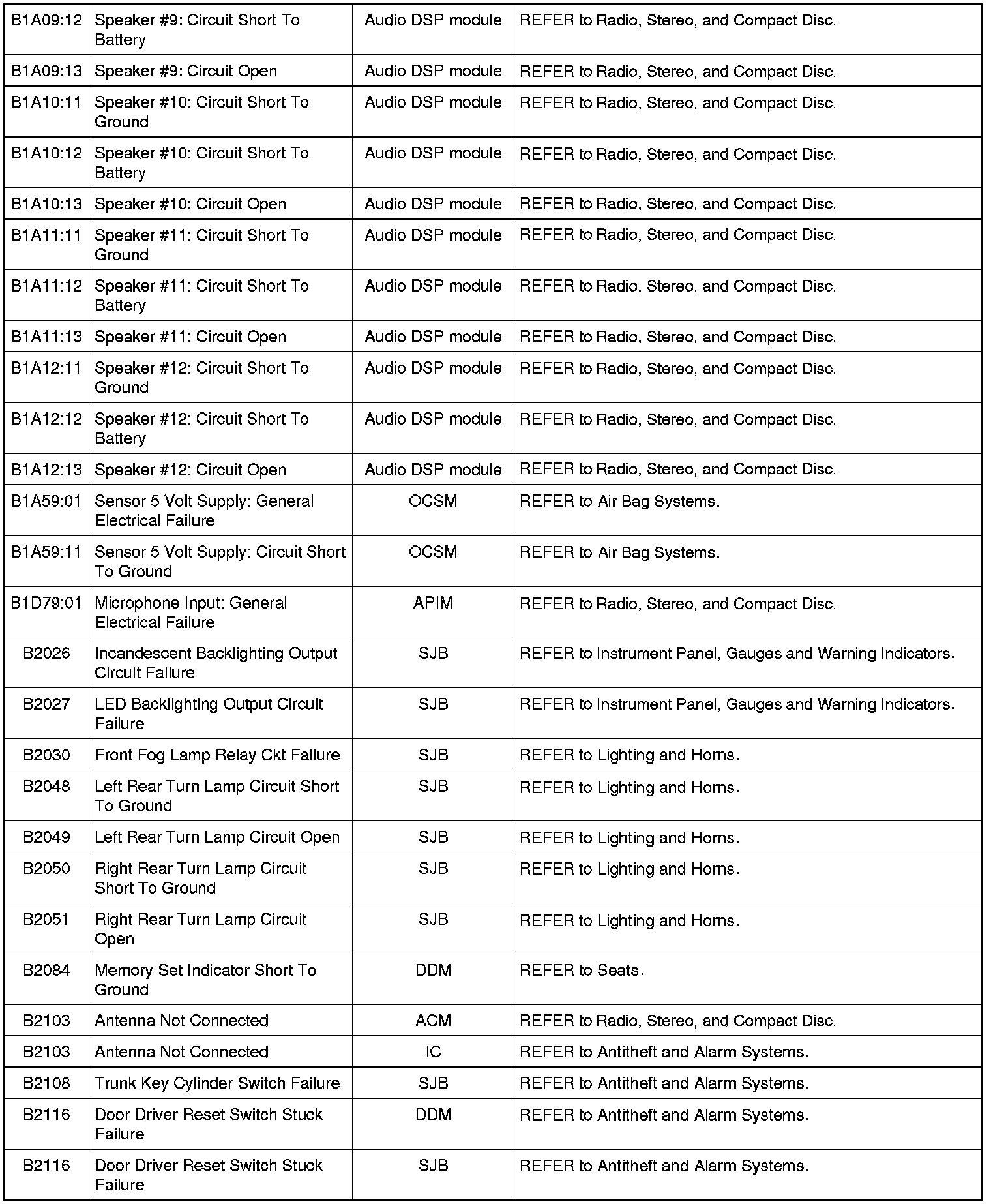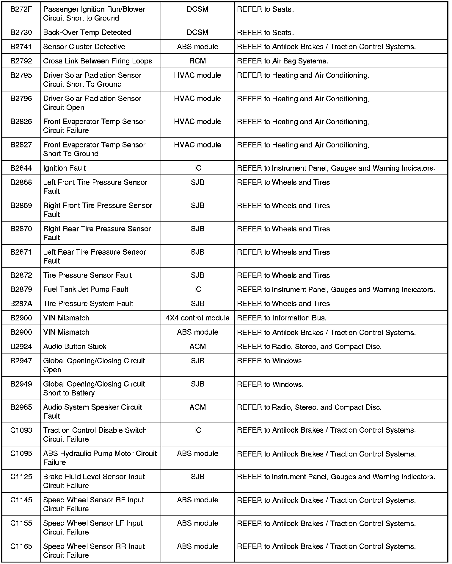 Home >> Ford >> 2009 >> Fusion AWD L4-2.3L >> Repair and Diagnosis >> Body and Frame >> Body Control Systems >> Testing and Inspection >> Diagnostic Trouble Code Descriptions >> Diagnostic Trouble Code (DTC) Chart