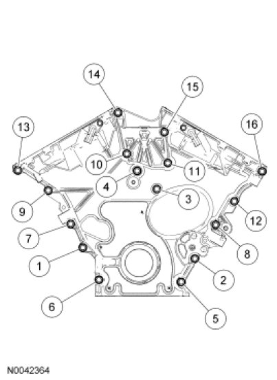Position the engine front cover and install the 14 bolts and the 2 stud bolts.