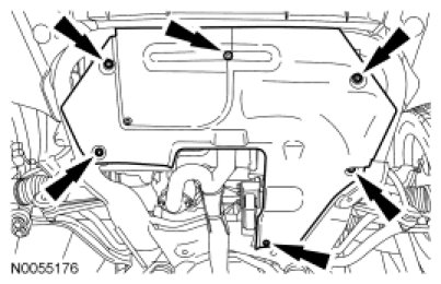 7. Remove the 6 pin-type retainers and the RH front structure-to-subframe splash shield.