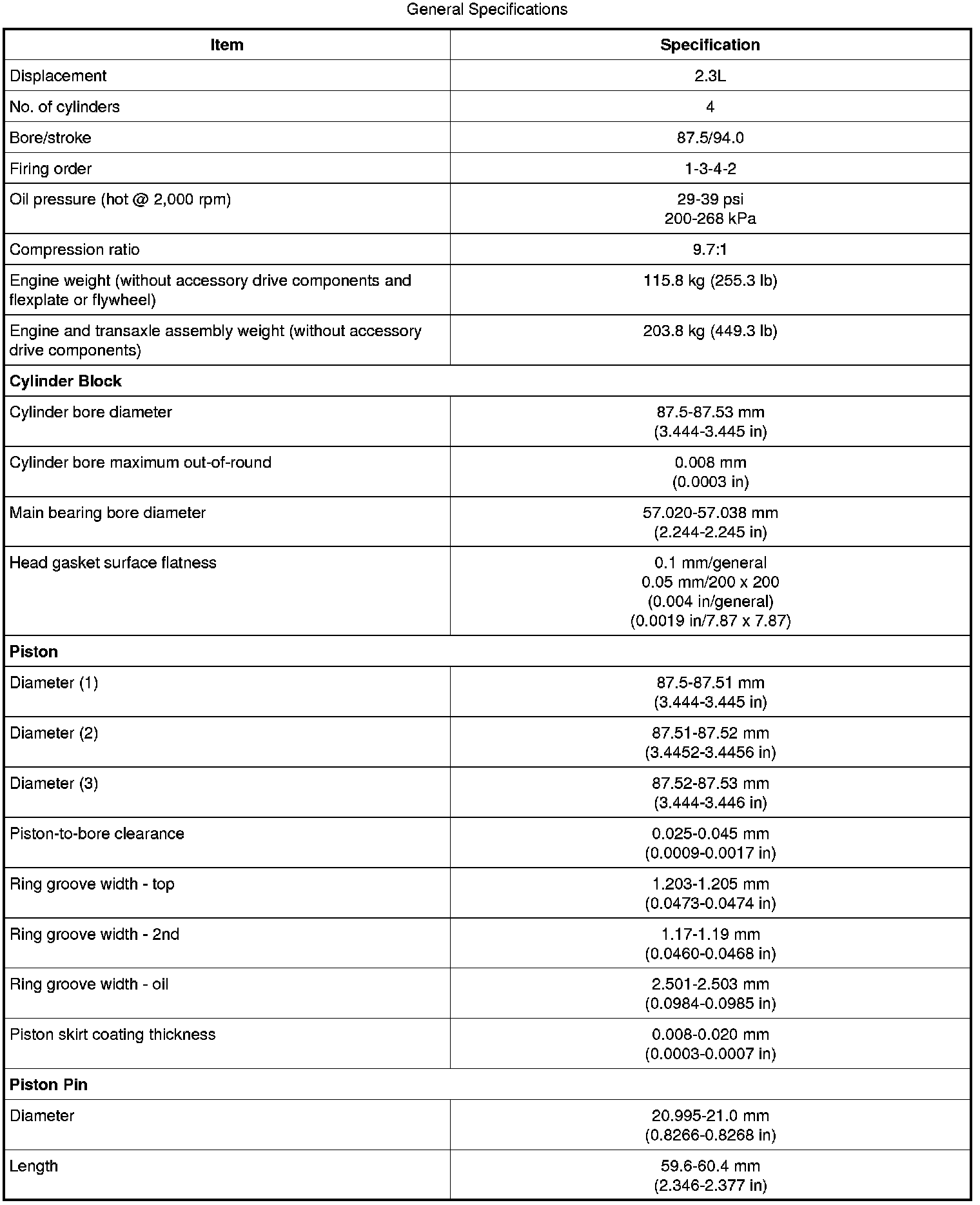 Home >> Ford >> 2009 >> Fusion FWD L4-2.3L >> Repair and Diagnosis >> Specifications >> Mechanical Specifications >> Engine >> Cylinder Block Assembly >> System Specifications