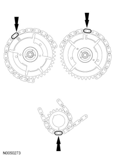 Position the LH timing chain on the camshaft sprocket. Make sure the camshaft sprocket timing mark is aligned with the colored (marked) chain link.