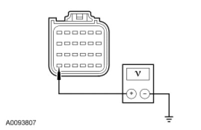 - Measure the voltage between the RCM C2041b-24, circuit CBP08 (GY/YE), harness side and ground.