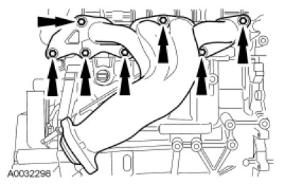 Position a new gasket and install the exhaust manifold and 7 new nuts.