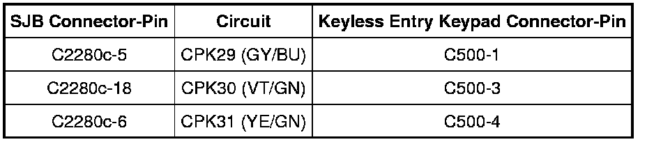 The Smart Junction Box (SJB) monitors the voltage drop on the 12-volt reference circuits CPK29 (GY/BU), CPK30 (VT/GN), and CPK31 (YE/GN) for the keyless entry keypad. The keypad is grounded through circuit GD133 (BK). When an individual keypad button is pressed an individual or a combination of the reference circuits are connected to ground. The SJB then determines which button was pressed based on which circuit(s) has a ground signal. Once the SJB determines that the 5-digit personal entry code, or the factory set 5-digit code has been entered on the keypad, the SJB then energizes the driver door unlock relay to unlock the driver door.