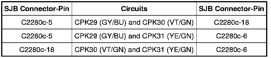 H9 CHECK CIRCUITS CPK29 (GY/BU), CPK30 (VT/GN) AND CPK31 (YE/GN) FOR A SHORT TO EACH OTHER