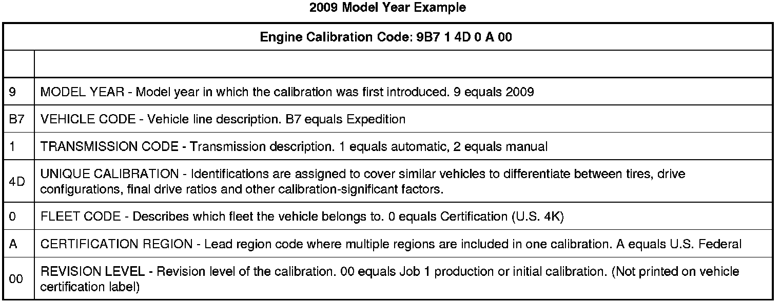 Base engine calibration information, sometimes referred to as the powertrain calibration, is located in the lower right corner of the vehicle certification label. Engine calibration information is limited to a maximum of 5 characters per line (2 lines maximum). Calibration information more than 5 characters long wrap to the second line of this field. Only the base calibration appears on this label. The revision level is no longer printed on the label, however, it can be found in the On-Line Automotive Service Information System (OASIS). For additional information on the vehicle certification label or engine calibration, refer to the Identification Codes.