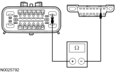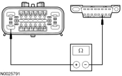 - Measure the resistance between the FSSM C3281a-8, circuit 1828 (PK/LG), harness side and the DLC C251-14, circuit 1828 (PK/LG), harness side.
