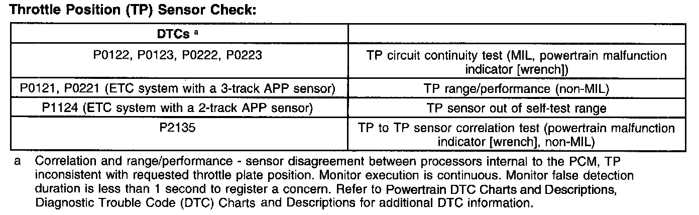 - There is one reference voltage and one signal return circuit between the PCM and the ETB. The reference voltage and the signal return circuits are shared with the reference voltage and signal return circuits used by the accelerator pedal position (APP) sensor. There are also 2 throttle position (TP) signal circuits for redundancy. The redundant TP signals are required for increased monitoring reasons. The first TP signal (TPS1-NS) has a negative slope (increasing angle, decreasing voltage) and the second signal (TPS2-PS) has a positive slope (increasing angle, increasing voltage). The TPS2-PS signal reaches a limit of approximately 4.5 volts at approximately 45 degrees of throttle angle.