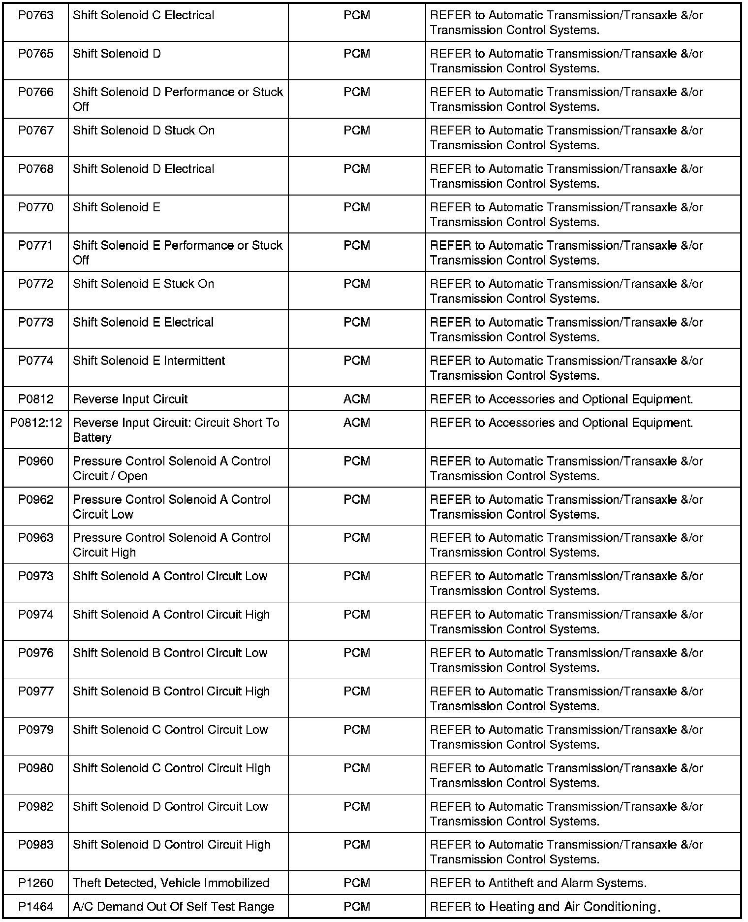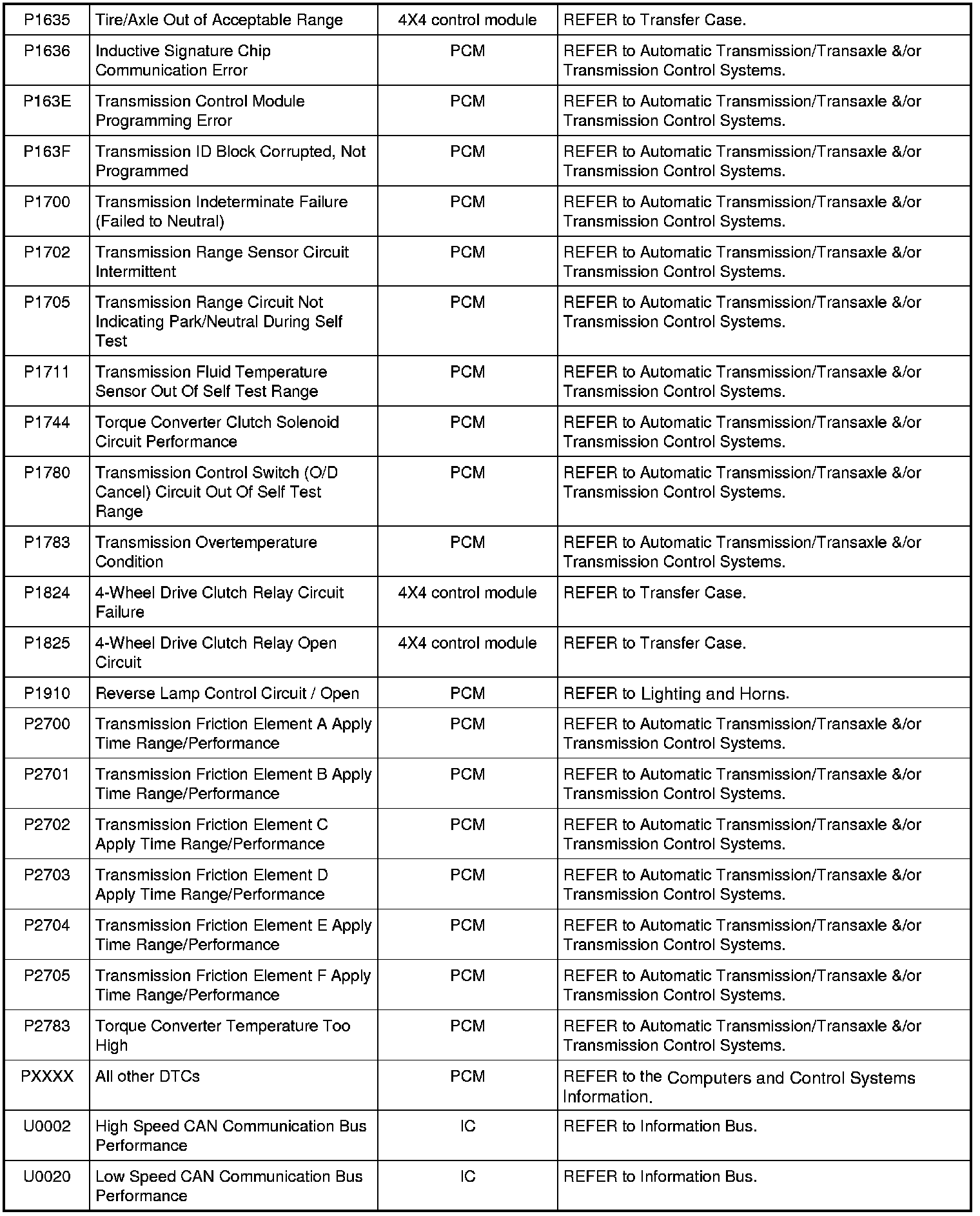 NOTE: Most powertrain (P-code) DTCs are diagnosed in Computers and Control Systems Information. If the P-code retrieved is not listed, refer to Computers and Control Systems Information to continue diagnostics.