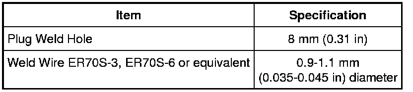 - Factory spot welds may be substituted with either Squeeze-Type Resistance Spot Welding (STRW) welds or MIG plug welds. Spot/plug welds should equal factory welds in both location and quantity. Do not place a new spot weld directly over an original weld location. Plug weld hole should equal 8 mm (0.31 in) diameter.
