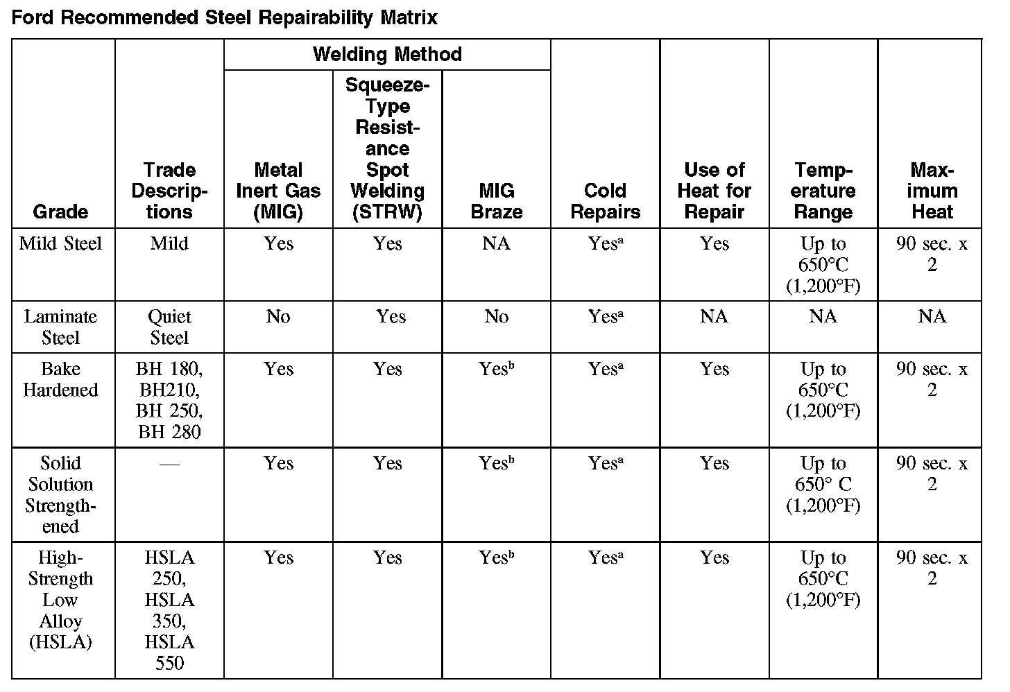 Ford Recommended Steel Repairability Matrix (Part 1):