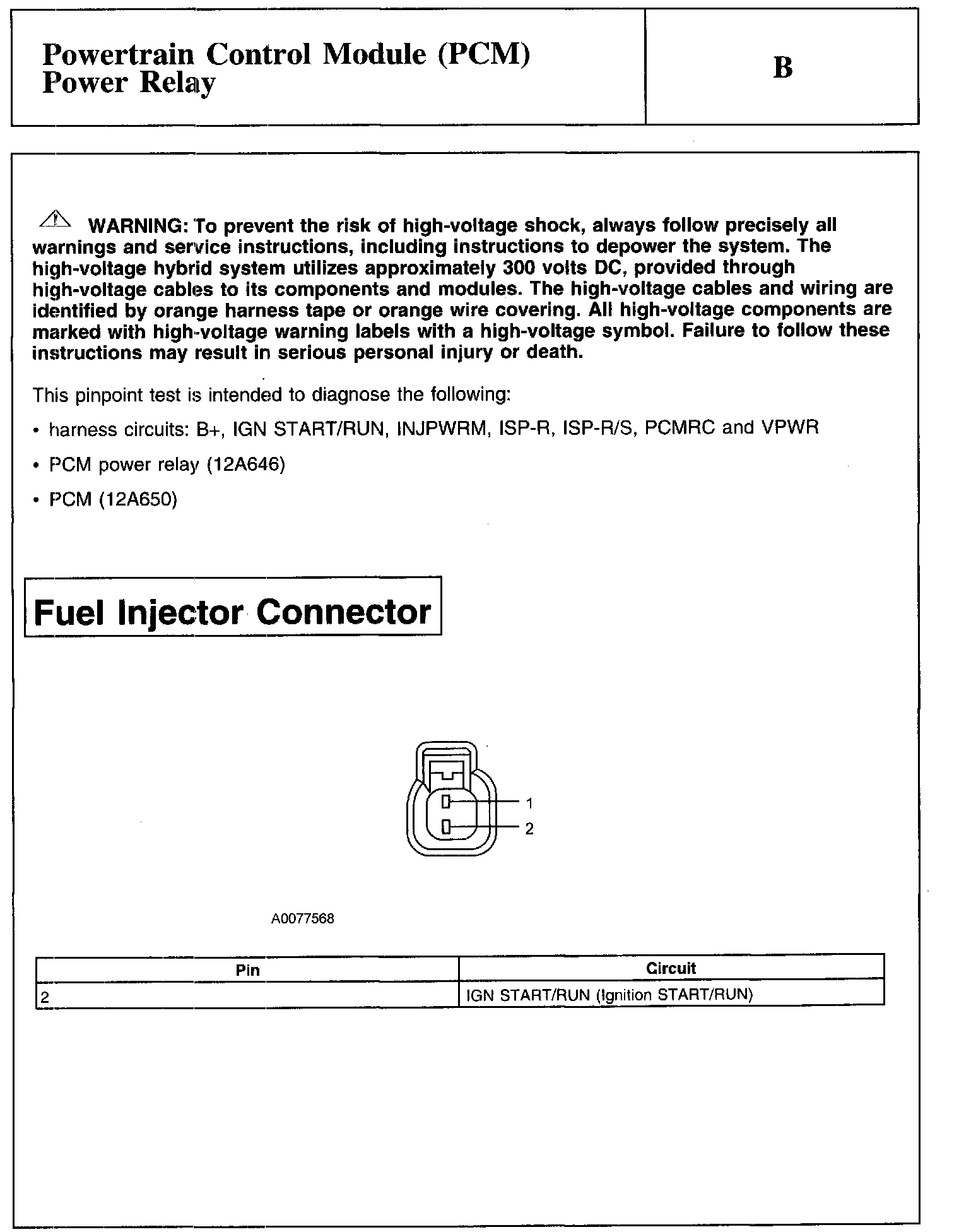 PINPOINT TEST B: POWERTRAIN CONTROL MODULE (PCM) POWER RELAYWarning And Fuel Injector Connector: