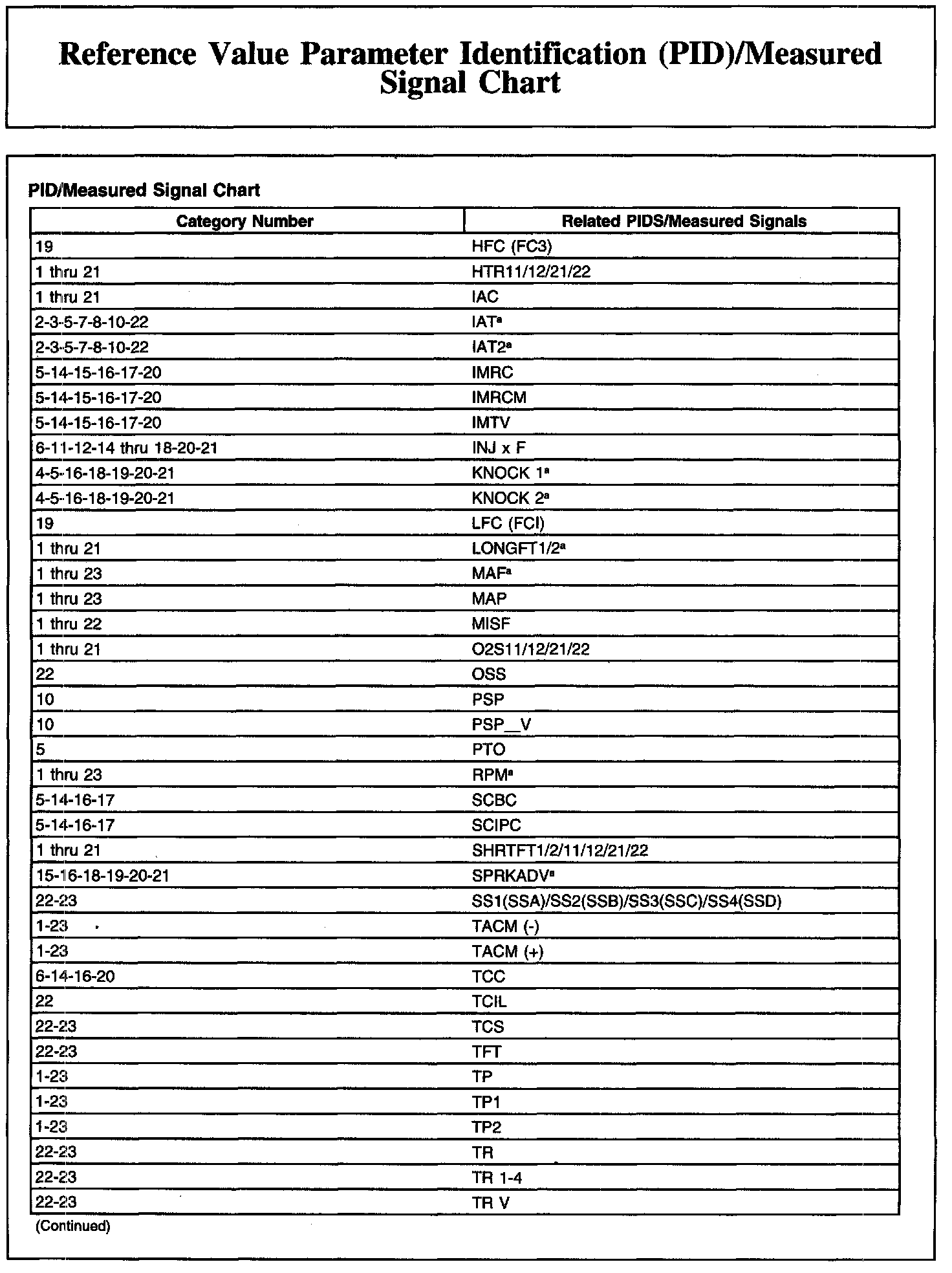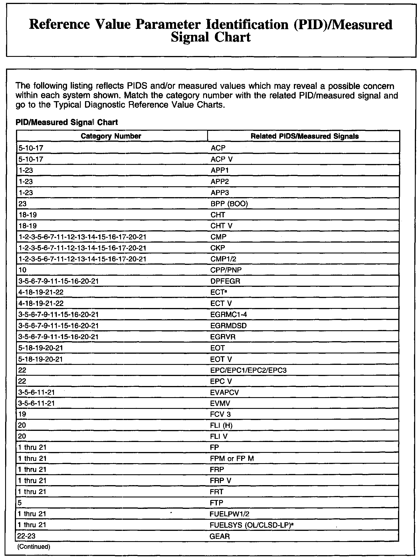 REFERENCE VALUE PARAMETER IDENTIFICATION (PID)/MEASURED SIGNAL CHART