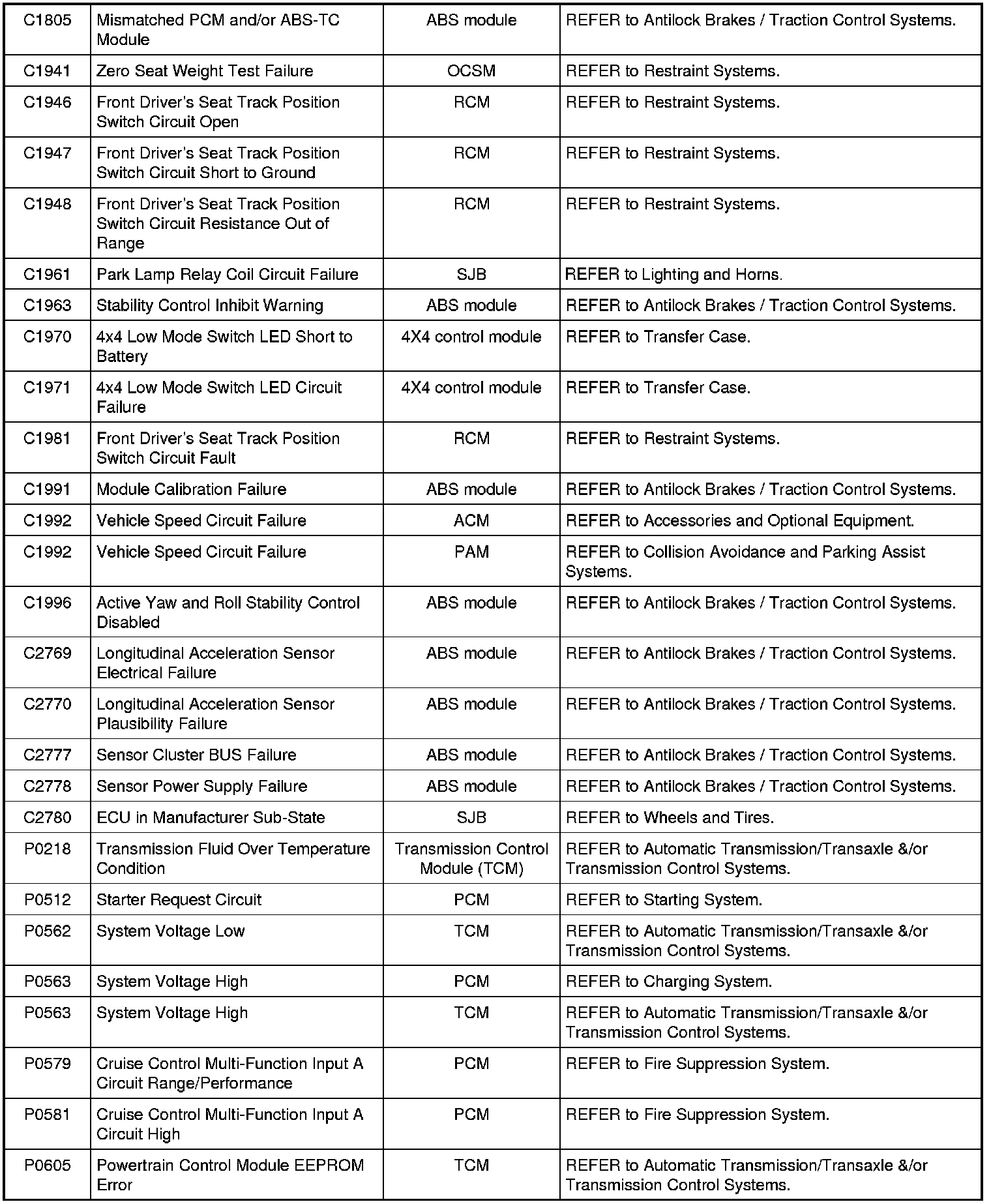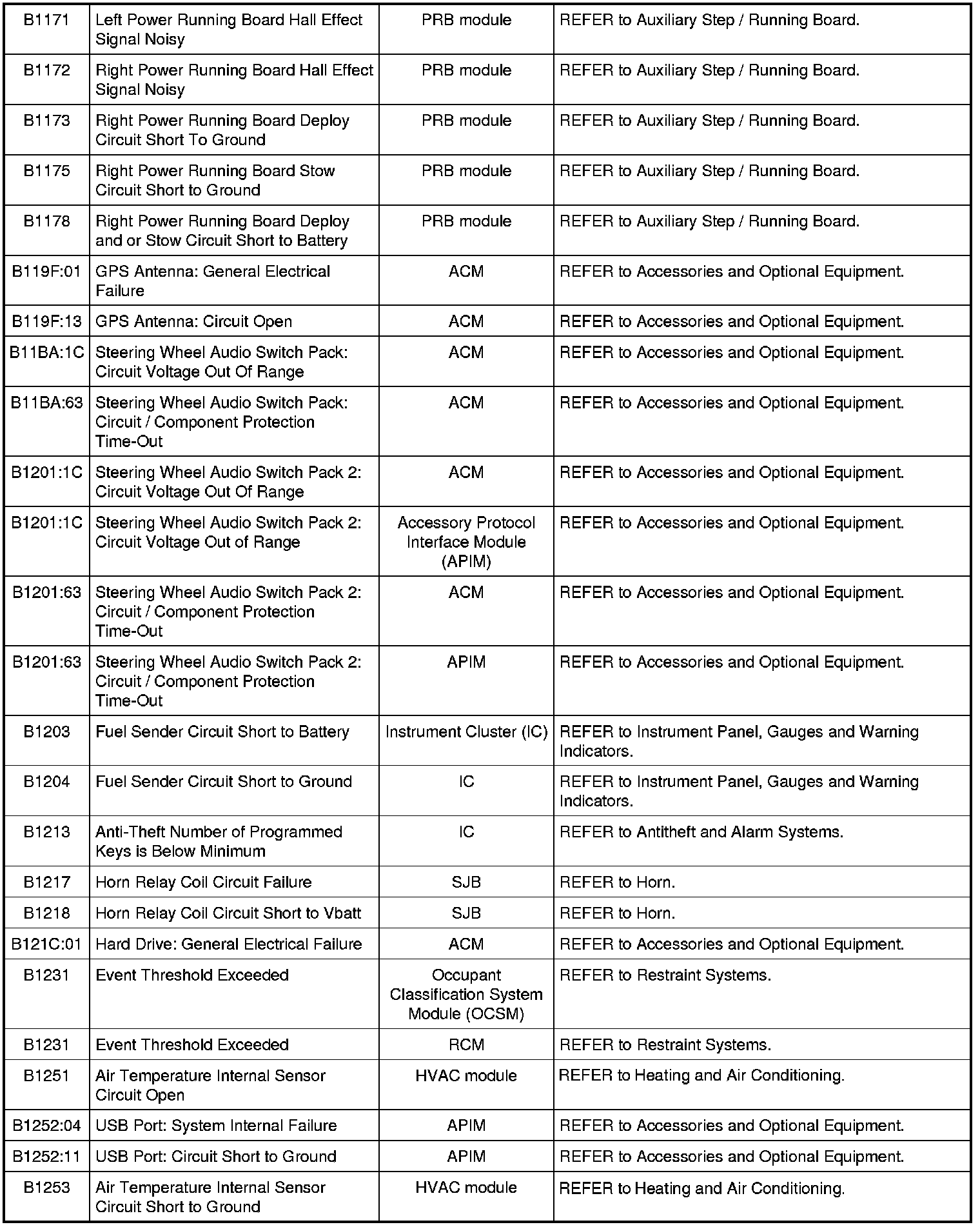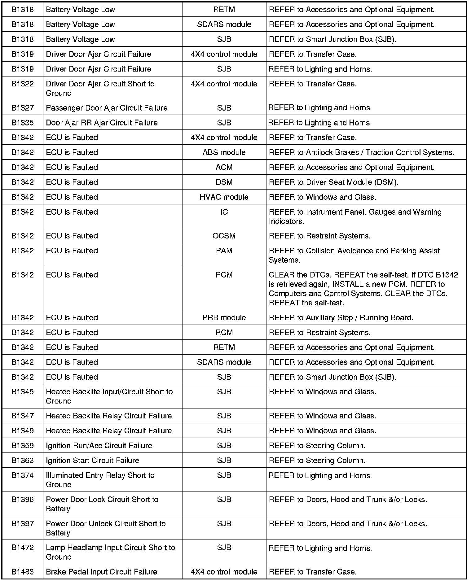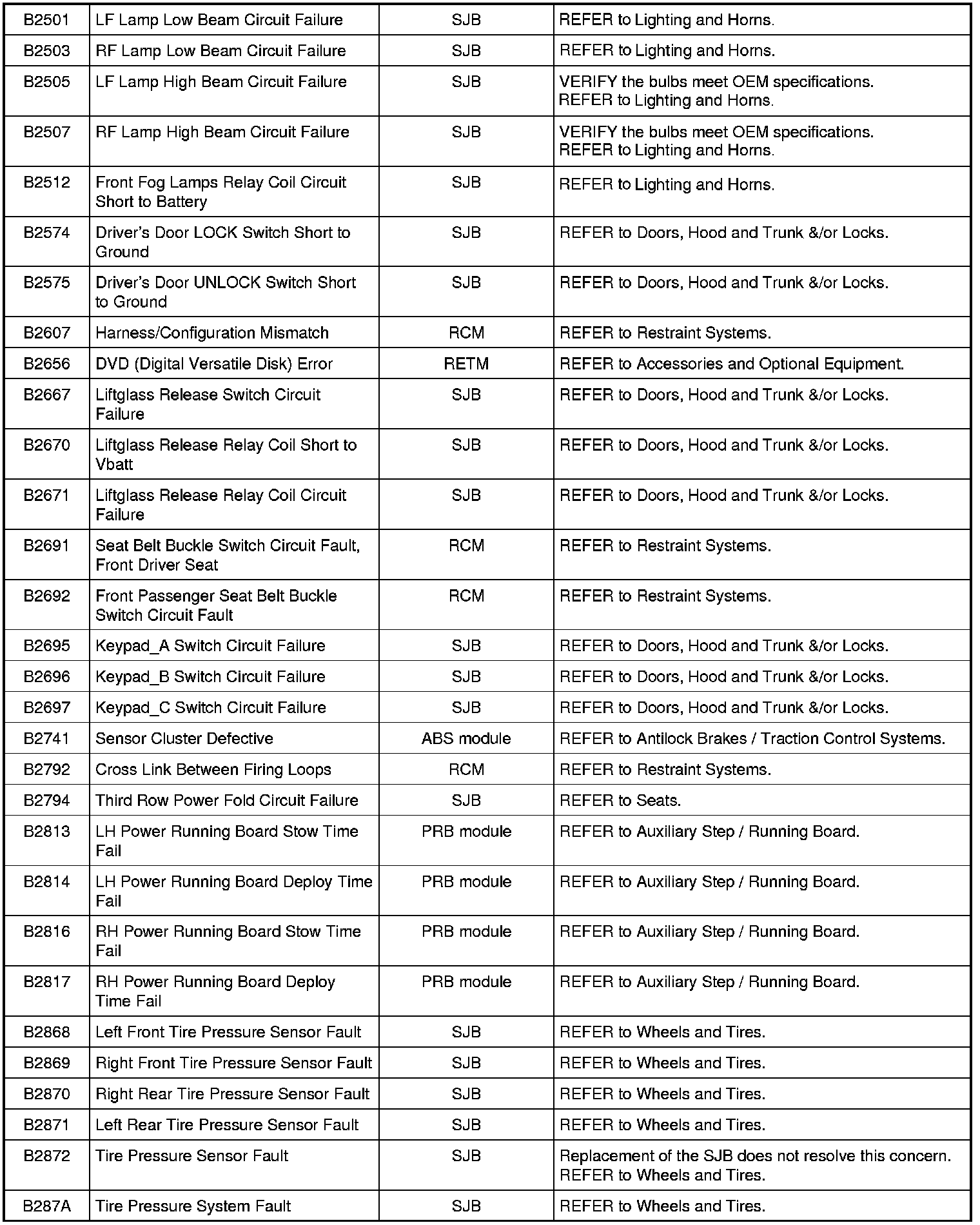Home >> Ford >> 2010 >> Explorer 2WD V8-4.6L >> Repair and Diagnosis >> Body and Frame >> Body Control Systems >> Testing and Inspection >> Diagnostic Trouble Code Descriptions >> Diagnostic Trouble Code (DTC) Chart