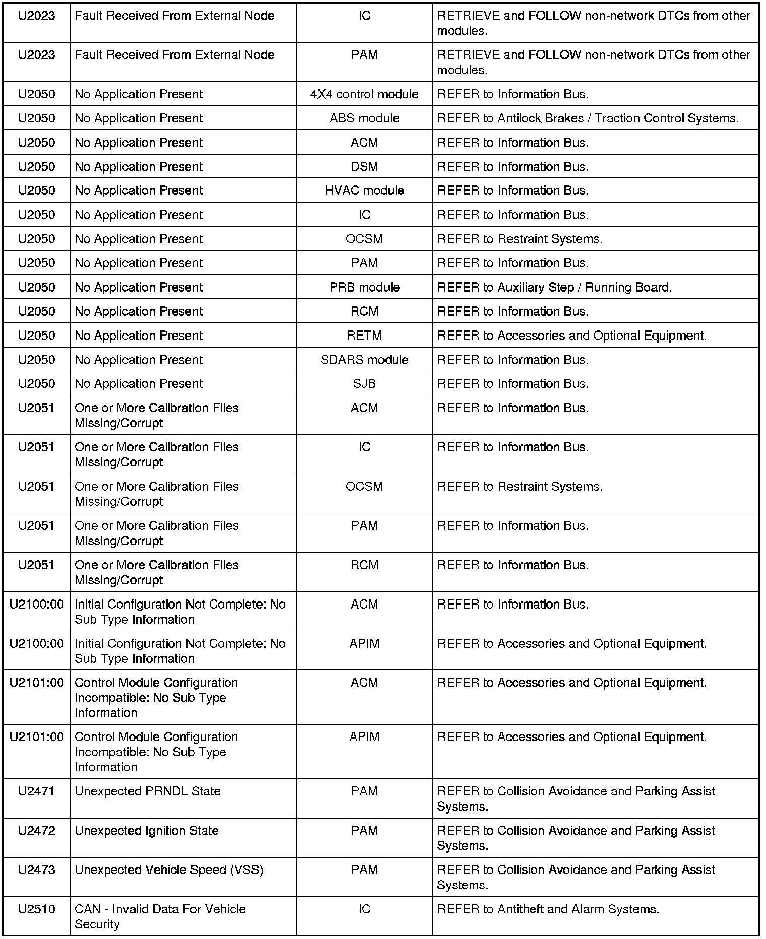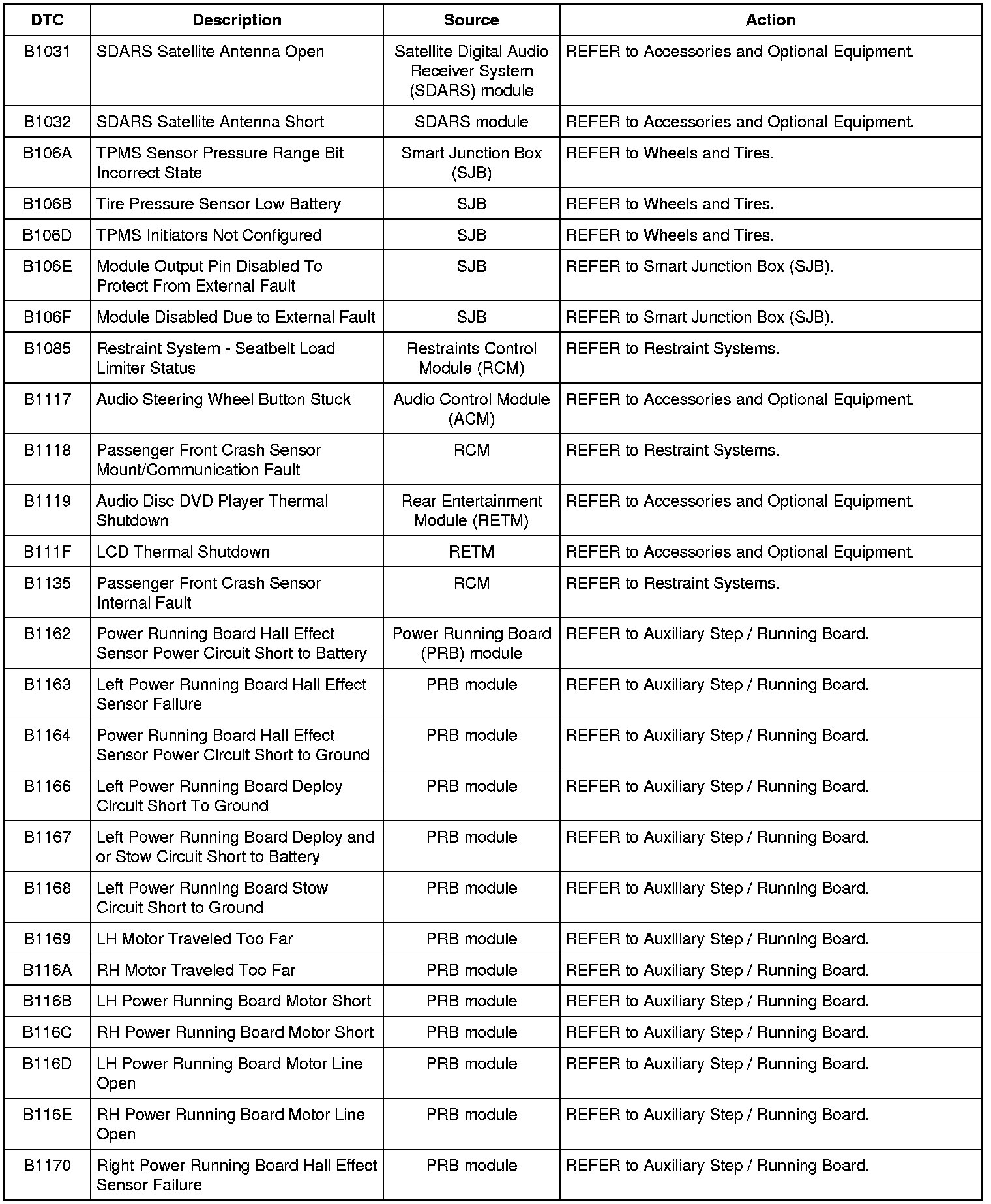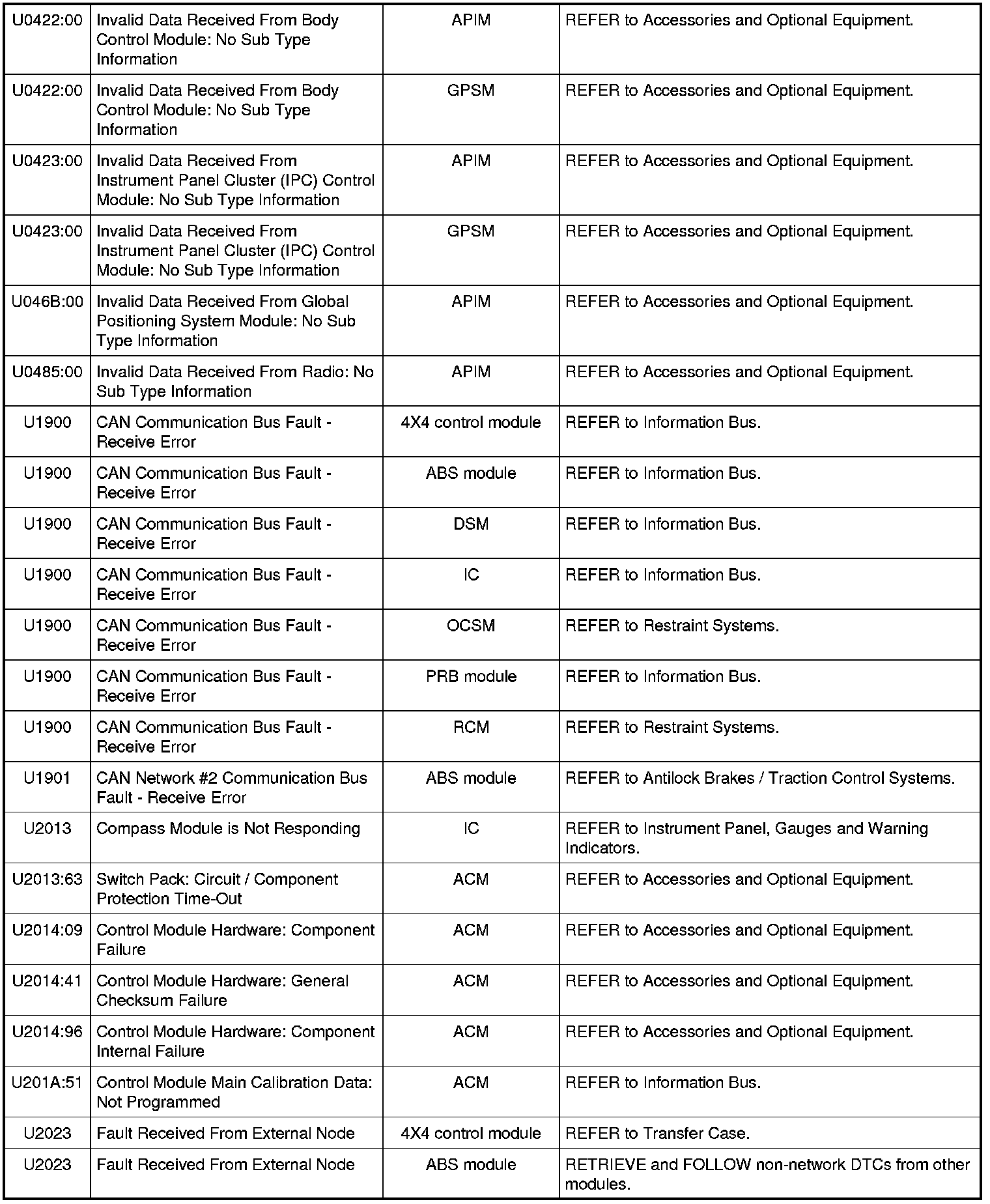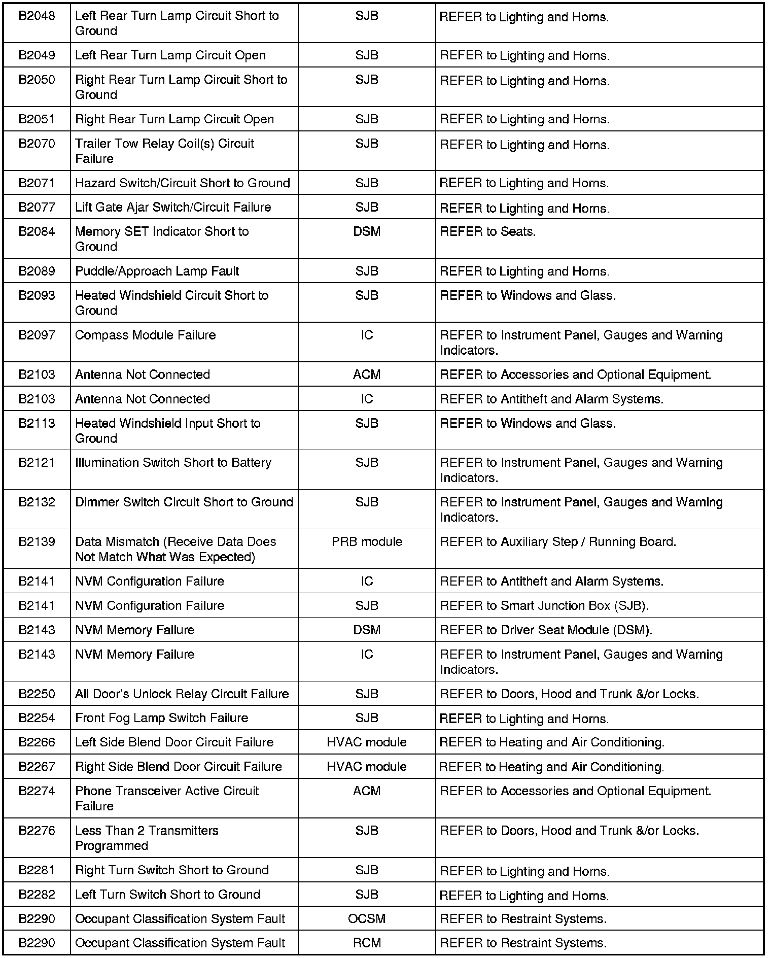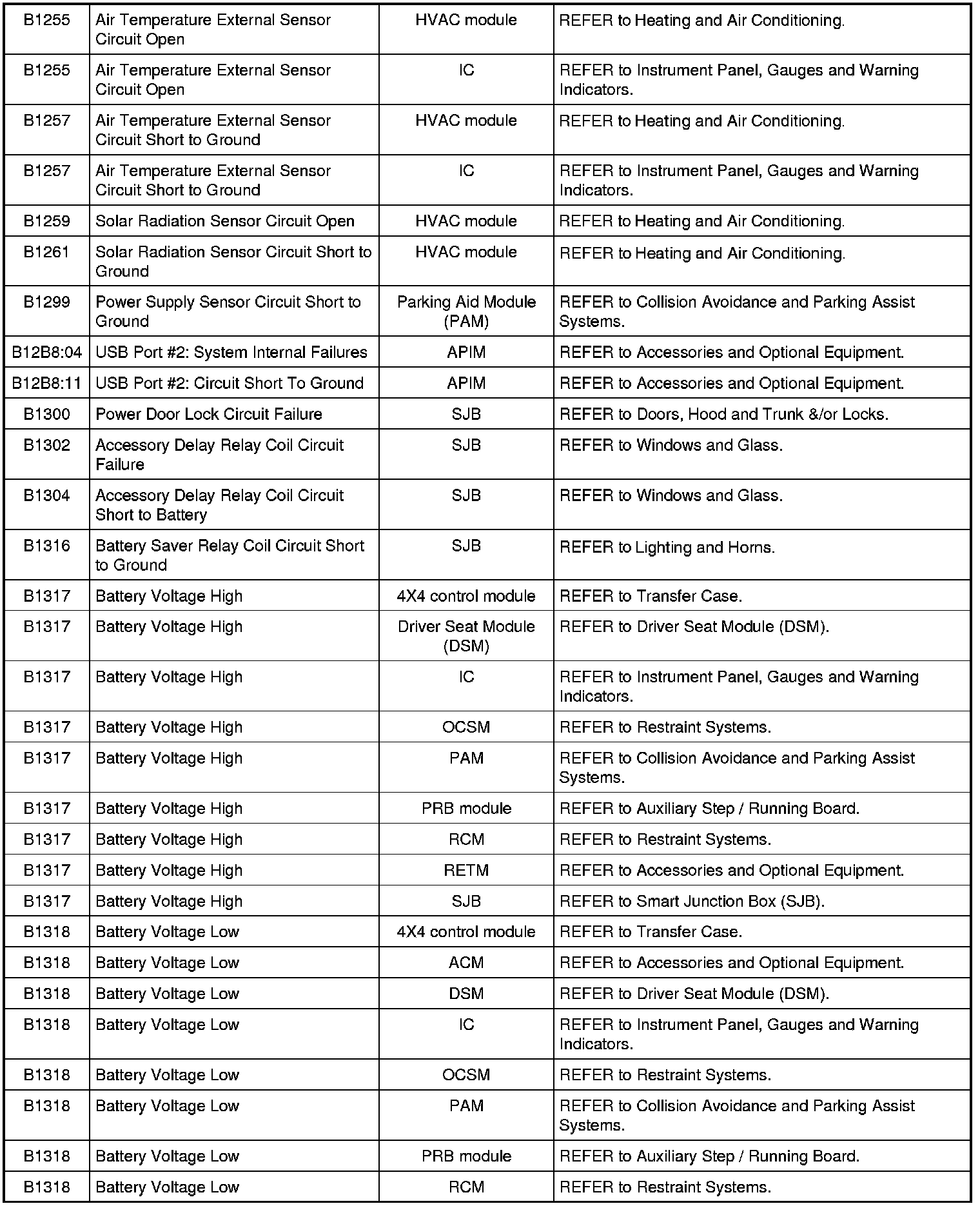 Home >> Ford >> 2010 >> Explorer 2WD V8-4.6L >> Repair and Diagnosis >> Body and Frame >> Body Control Systems >> Testing and Inspection >> Diagnostic Trouble Code Descriptions >> Diagnostic Trouble Code (DTC) Chart