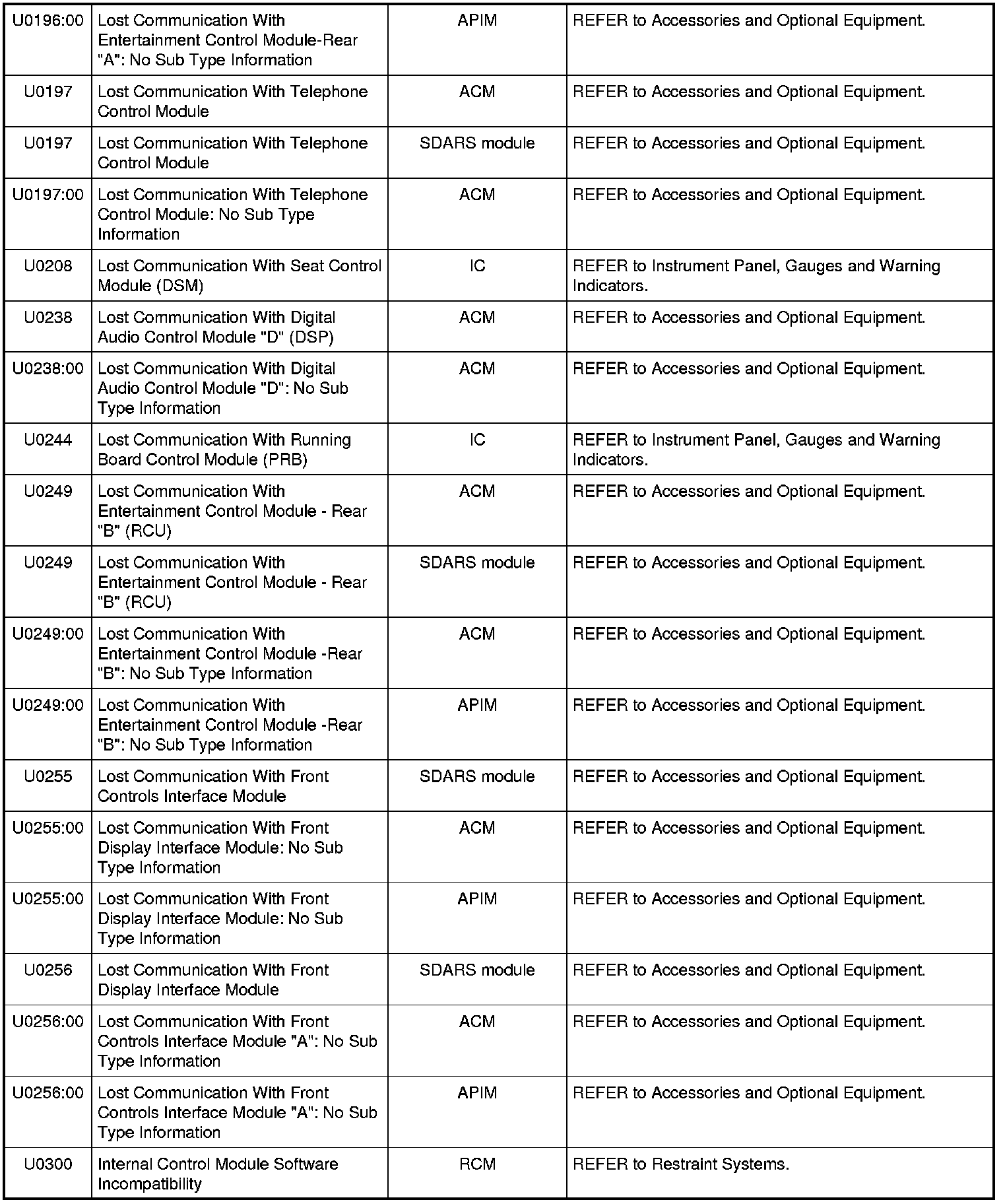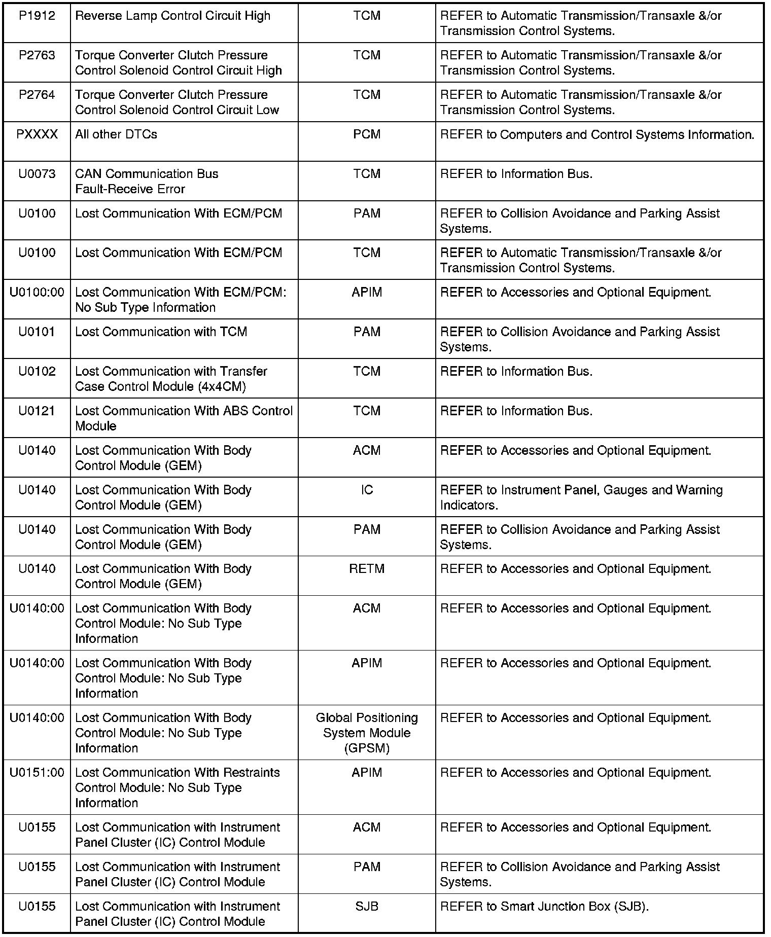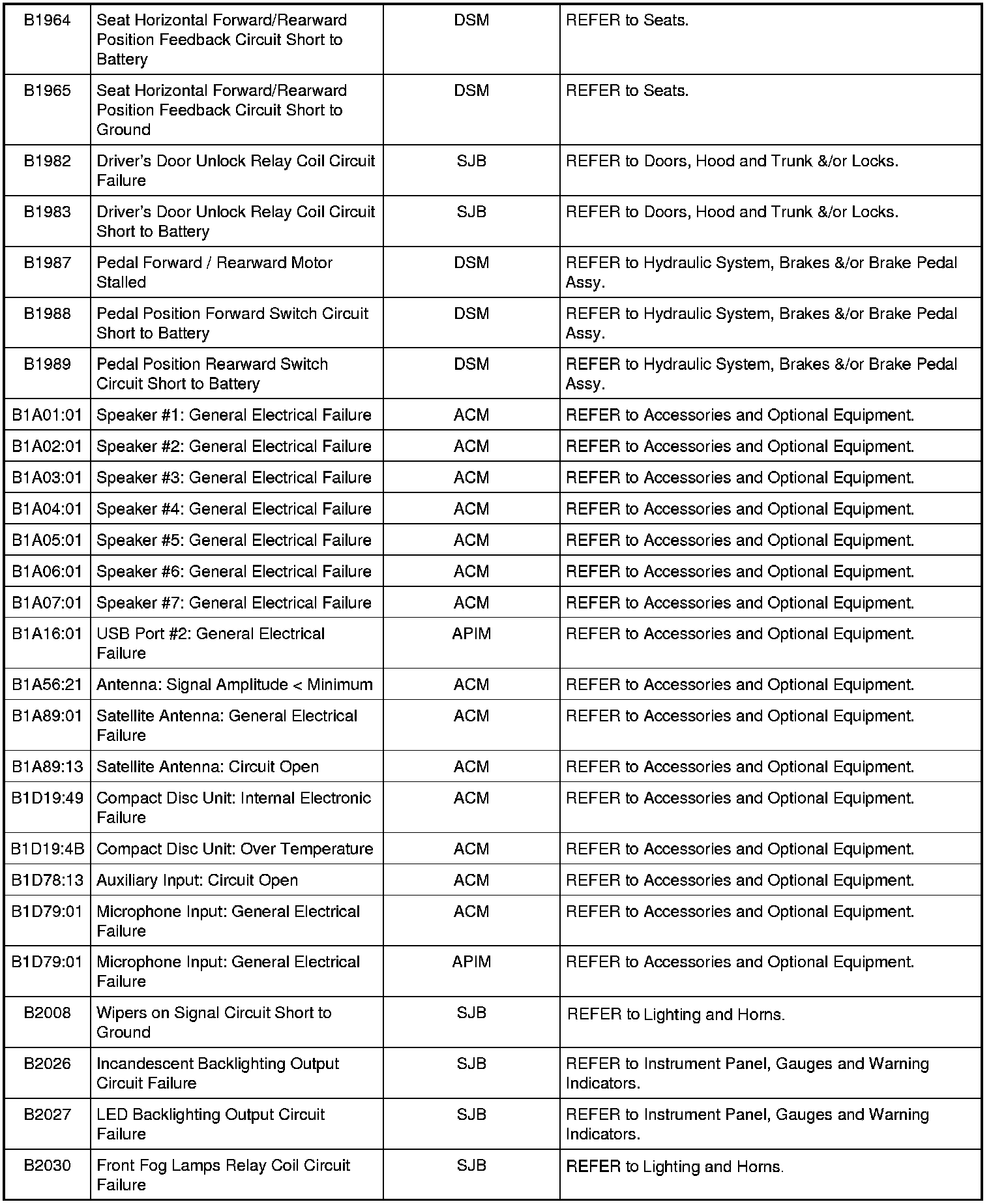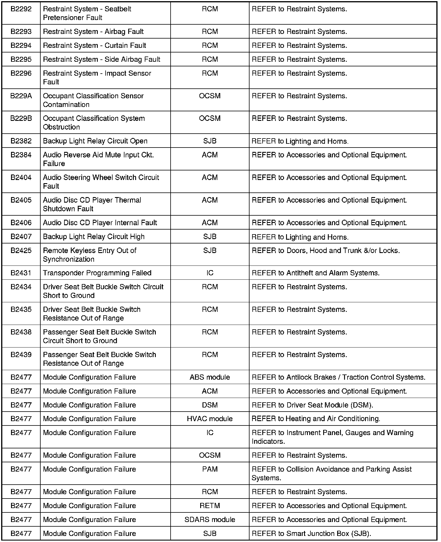 Home >> Ford >> 2010 >> Explorer 2WD V8-4.6L >> Repair and Diagnosis >> Body and Frame >> Body Control Systems >> Testing and Inspection >> Diagnostic Trouble Code Descriptions >> Diagnostic Trouble Code (DTC) Chart