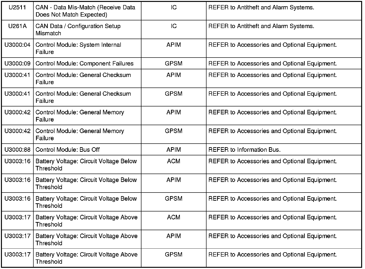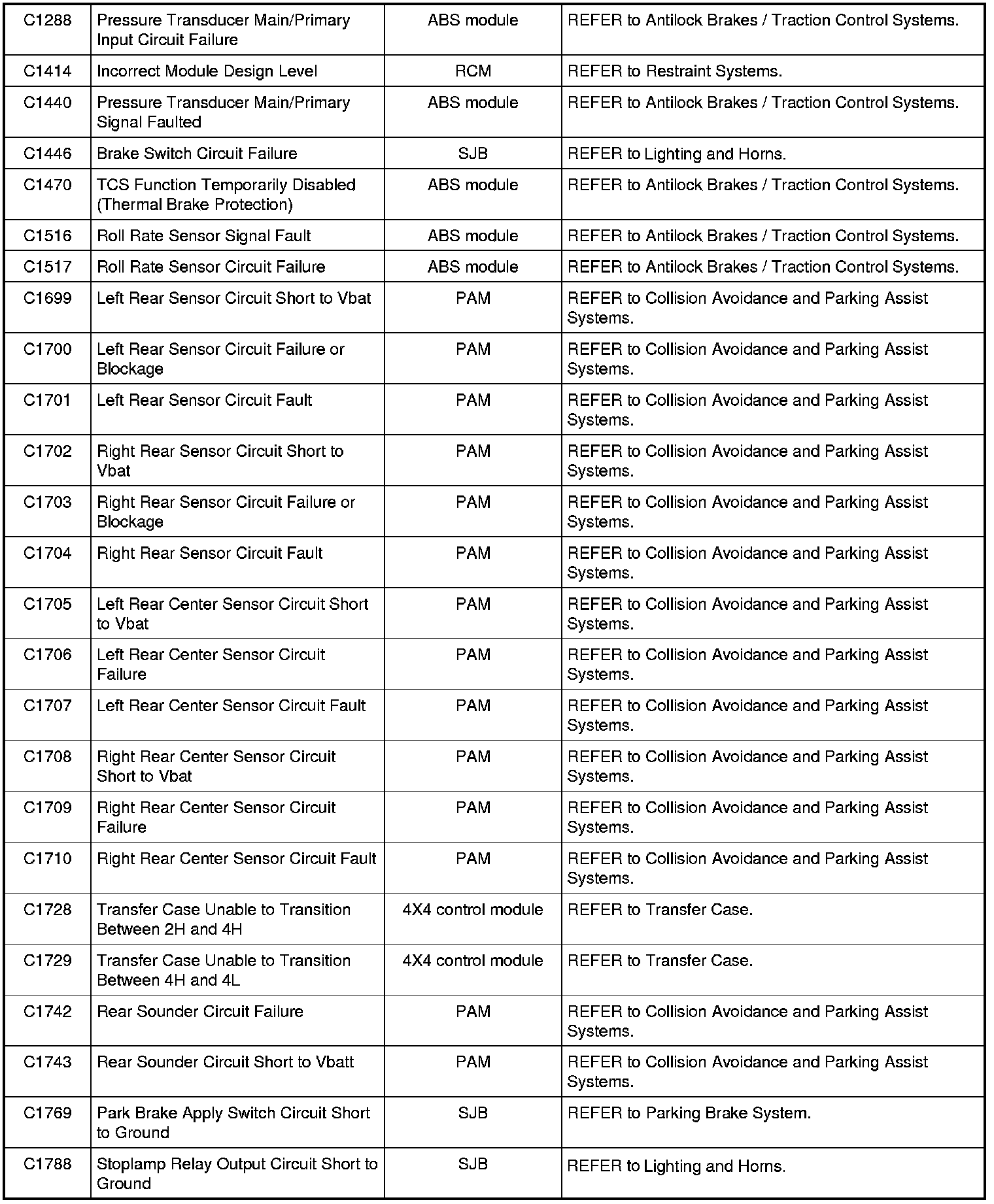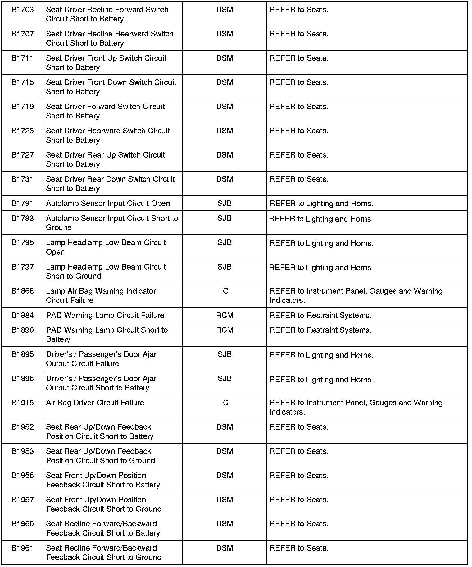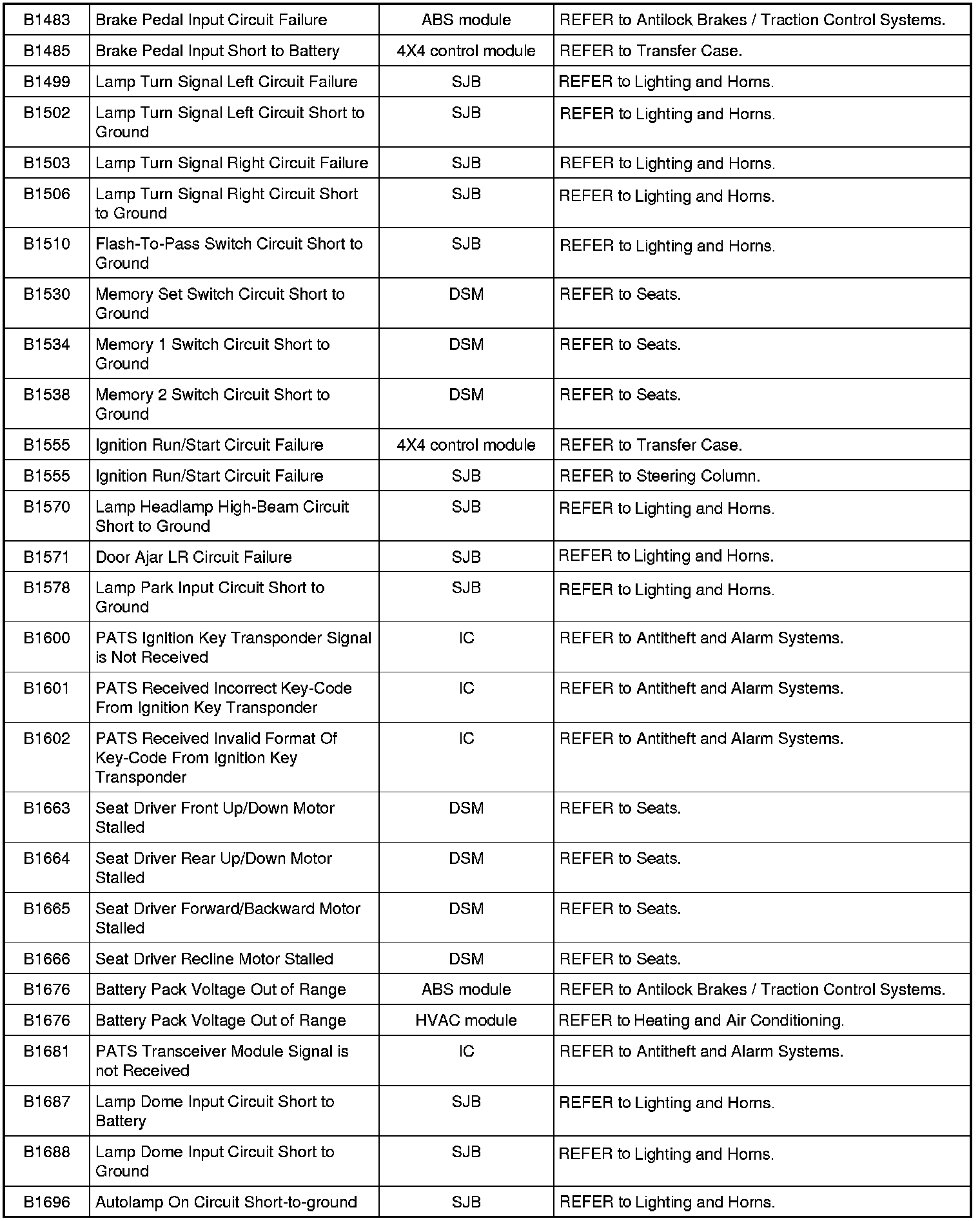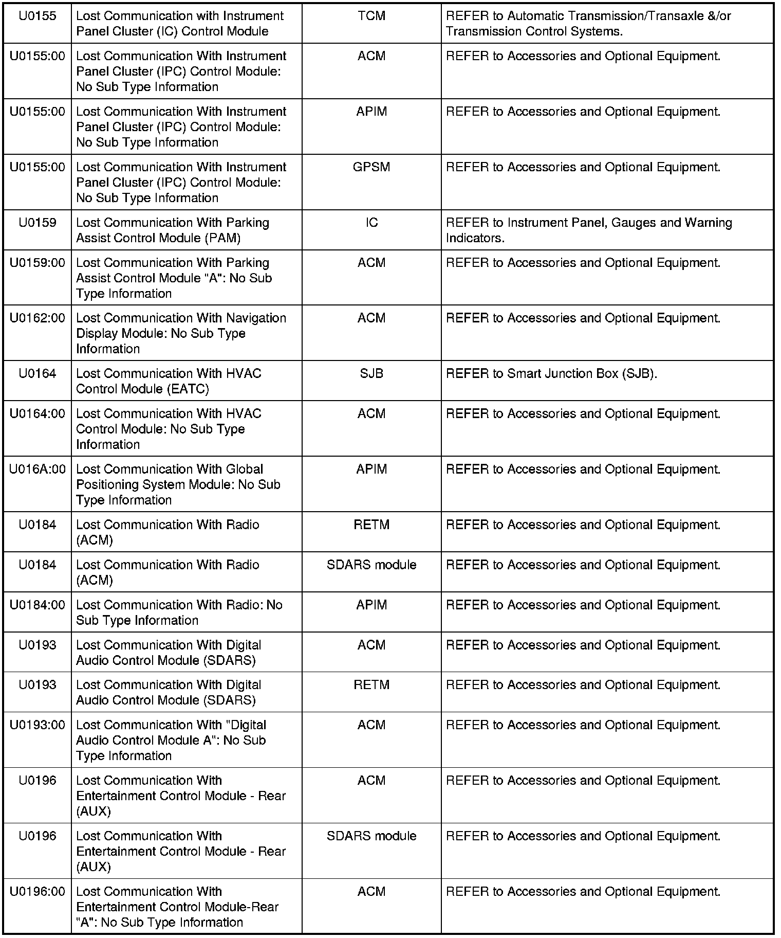 Home >> Ford >> 2010 >> Explorer 2WD V8-4.6L >> Repair and Diagnosis >> Body and Frame >> Body Control Systems >> Testing and Inspection >> Diagnostic Trouble Code Descriptions >> Diagnostic Trouble Code (DTC) Chart