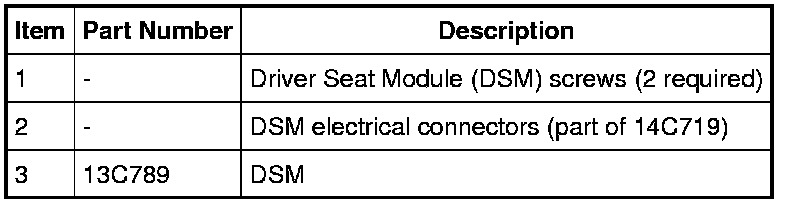 NOTE: Prior to the removal of the module, it is necessary to upload the module configuration information to the scan tool. This information must be downloaded into the new Driver Seat Module (DSM) after installation. For additional information, refer to Information Bus.